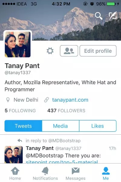 案例學(xué)習(xí):Twitter上的切換鍵被放在屏幕的端。這幫助用戶更加快速的觸碰相關(guān)鍵如主頁(Home)、通知(Notifications)、消息(Messages)、我(Me)以進入軟件的各個部分。他們曾經(jīng)將按鍵放在了最頂端,然而這增加了大屏用戶使用難度。