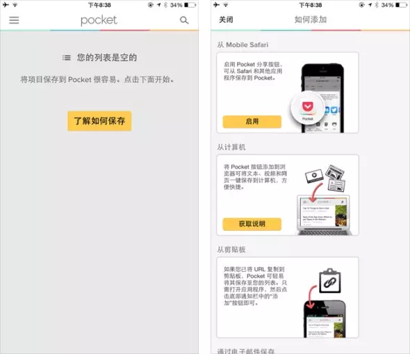Pocket是一個可以讓用戶把內(nèi)容(文字、圖片甚至視頻)一鍵保存下來,用于其他時間完成閱讀的工具。在初次使用時它的列表頁面內(nèi)沒有內(nèi)容時,會顯示一個“了解如何保存”的按鈕,點擊可以詳細(xì)了解添加列表的各種方法。