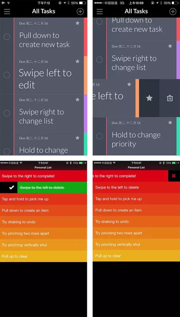 Taasky和Clear作為兩款交互優(yōu)秀的任務(wù)應(yīng)用,都擁有非常豐富手勢操作,它們沒有像別的軟件一樣在界面上加遮罩、標(biāo)注做出冗長的用戶教育頁,而是直接將操作指引嵌在一條條的任務(wù)里,用戶只要跟著當(dāng)前任務(wù)的簡單描述滑動屏幕就能了解全部手勢操作,即充實了原本空白的缺省頁面又很自然地指導(dǎo)用戶如何使用該軟件。