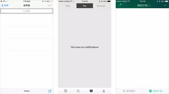 缺省頁面,是出現(xiàn)在用戶沒有提交任何資料或者網(wǎng)絡(luò)連接不通暢的情況下所展現(xiàn)的頁面。通常設(shè)計師們習(xí)慣用豐富的數(shù)據(jù)內(nèi)容把頁面設(shè)計得美觀實用,考慮的都是界面展現(xiàn)的“理想狀態(tài)”,往往會忽視沒有內(nèi)容的“缺省狀態(tài)”。未經(jīng)過精心設(shè)計的缺省頁面降低了用戶的使用體驗,并可能給用戶帶來困擾,如下圖iOS系統(tǒng)郵件App,無郵件時界面上沒有任何有效反饋信息,用戶不能明確得知到底是網(wǎng)絡(luò)問題還是賬號同步出錯亦或者是收件箱內(nèi)確實一封郵件都沒有。同樣的情況也出現(xiàn)在Pinterest和出發(fā)吧的界面里。