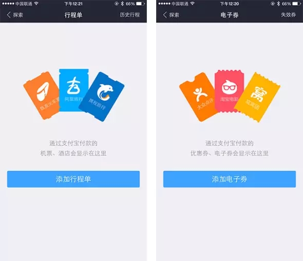 支付寶錢包的電子券和行程單頁面通過票據(jù)圖形+文字清楚地說明該分類下會出現(xiàn)什么內(nèi)容,并在屏幕下方提供添加票據(jù)的按鈕。