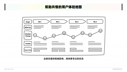 圖表、筆記、錄制設(shè)備是幫助我們共情的最好工具,在不同的場(chǎng)景下,這些工具能夠幫助我們更好的收集信息,并且便于我們思考和共情。我們?cè)诙虝r(shí)間能記住的信息是有限的,這也是為什么我們會(huì)用到7±2這種定律去控制信息量的原因。以用戶體驗(yàn)地圖為例,在記載用戶體驗(yàn)產(chǎn)品的過(guò)程中,便是一種很好的共情輔助工具,它能夠按照使用步驟或階段記載用戶使用情況和情緒變化等反饋。