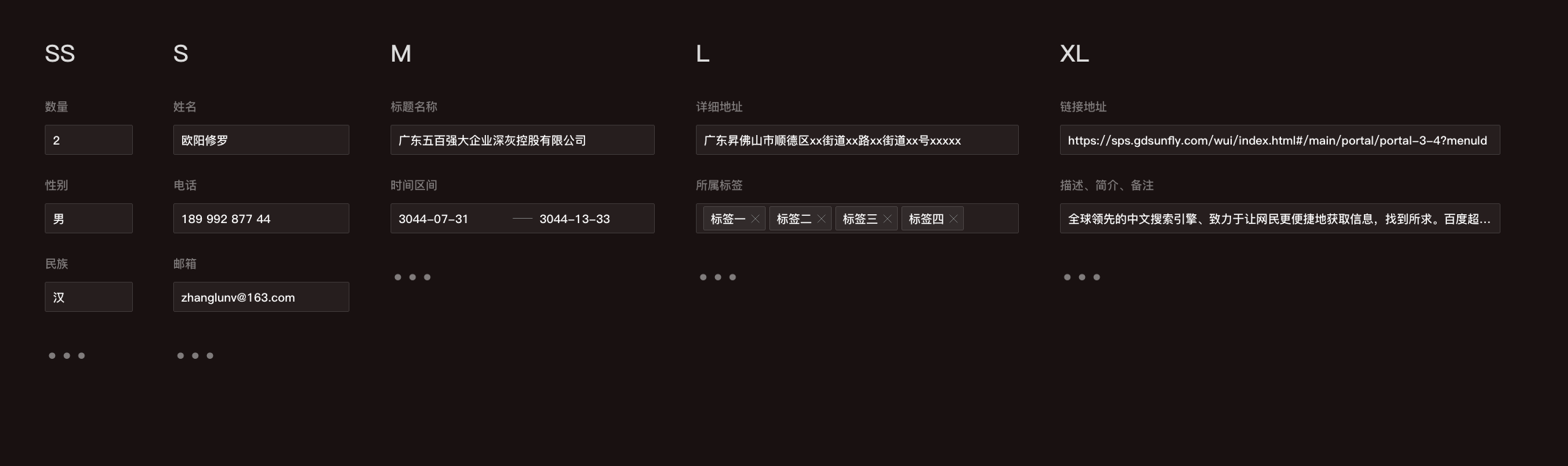 超短(XS):用于短數(shù)字、超短文本 短(S):適用于較短文本輸入,如個人信息(姓名、電話、郵箱等) 標(biāo)準(zhǔn)(M):默認(rèn)輸入框長度,適用大多數(shù)情況 長(L):適用較長文本輸入,如網(wǎng)頁地址、標(biāo)簽組等 超長(XL):適用超長文本輸入如正文(描述信息、備注、摘要、介紹、備注)、超長鏈接等選擇合適的輸入框?qū)挾瓤梢詫κ褂谜弋a(chǎn)生一定的心理暗示從而來減輕使用者的心理負(fù)擔(dān),因為在看到字段標(biāo)題時,心理都會產(chǎn)生對所填信息的預(yù)期,大概我要填寫什么,如果選用的輸入框?qū)挾炔缓线m一方面會對使用者造成一定的填寫負(fù)擔(dān),同時還會對用戶產(chǎn)生一定程度的誤導(dǎo)。比如:填寫戶籍所在地時,如果輸入框給的太寬就會疑惑,到底應(yīng)該寫“xx省xx市”、還是應(yīng)該填到具體“省-市-區(qū)-街道-xx號”呢?當(dāng)遇到更復(fù)雜的場景和混排輸入框的情況,為了讓頁面呈現(xiàn)的內(nèi)容更加有序、整齊,可參照山歌系統(tǒng)的定義方式來定義5種梯度寬度,從而方便設(shè)計執(zhí)行和技術(shù)開發(fā)。比如定義為 A=超短(XS)的寬度;短(S)的寬度=2A+n;以此類推