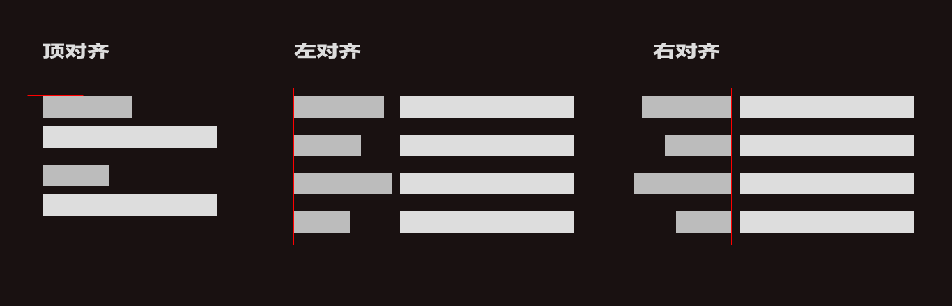 通常有三種對齊方式:頂對齊、左對齊、右對齊如圖例所示