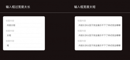 采用這樣的處理方式時,需要控制表單內(nèi)輸入內(nèi)容的長度高度一致,不然會面臨以下兩種尷尬:面對尷尬一(長度定太短)內(nèi)容擴(kuò)展性太差,無法同時滿足大段信息展示。面對尷尬一(長度定太長)輸入框當(dāng)只填寫一兩個字符時,會很空視覺效果不佳。