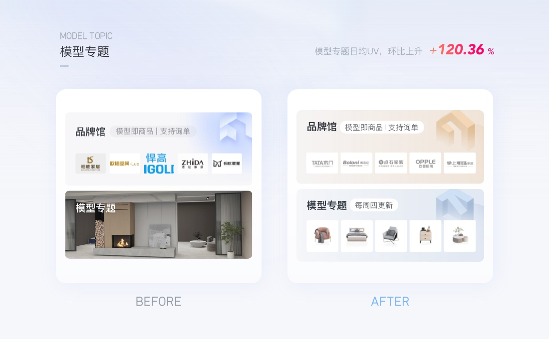 群核下的設計工具,以專題化的形式聚類商家、平臺推薦的模型是基本的運營動作,如下圖,原本以真實效果圖的方式展示模型專題,用戶難以感知是方案還是模型。通過封面圖形的優(yōu)化:將核心的模型類型展示出來,用戶能夠預見里面的內(nèi)容。