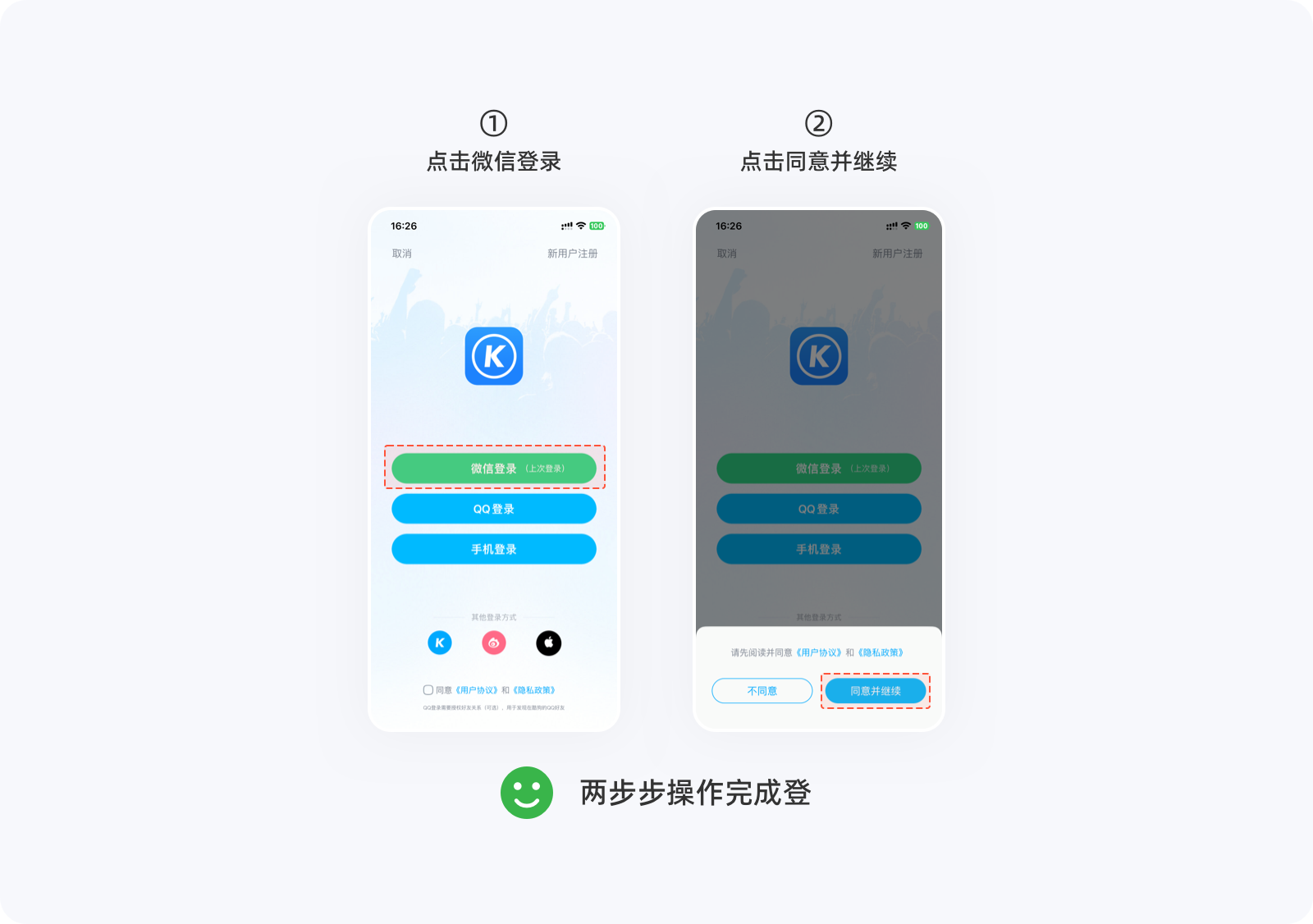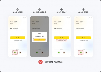 用戶在進(jìn)行一個(gè)任務(wù)時(shí),提升任務(wù)完成率最好的辦法就是避免復(fù)雜,任何一個(gè)流程,能用N次操作解決的事情,就不要用N+1次操作來完成,讓用戶以最少的點(diǎn)擊次數(shù)就能完成任務(wù),以提升用戶對(duì)產(chǎn)品的滿意度與忠誠(chéng)度。下圖是用戶登錄未勾選「用戶服務(wù)協(xié)議」,圖1、圖2分別給出了不同的交互流程,顯然,圖2的操作次數(shù)更少,讓登錄變的更容易完成。在設(shè)計(jì)一個(gè)功能時(shí),如果存在多種交互方案,那么最簡(jiǎn)單那個(gè)肯定是最好的。▽圖1:四步操作完成登錄