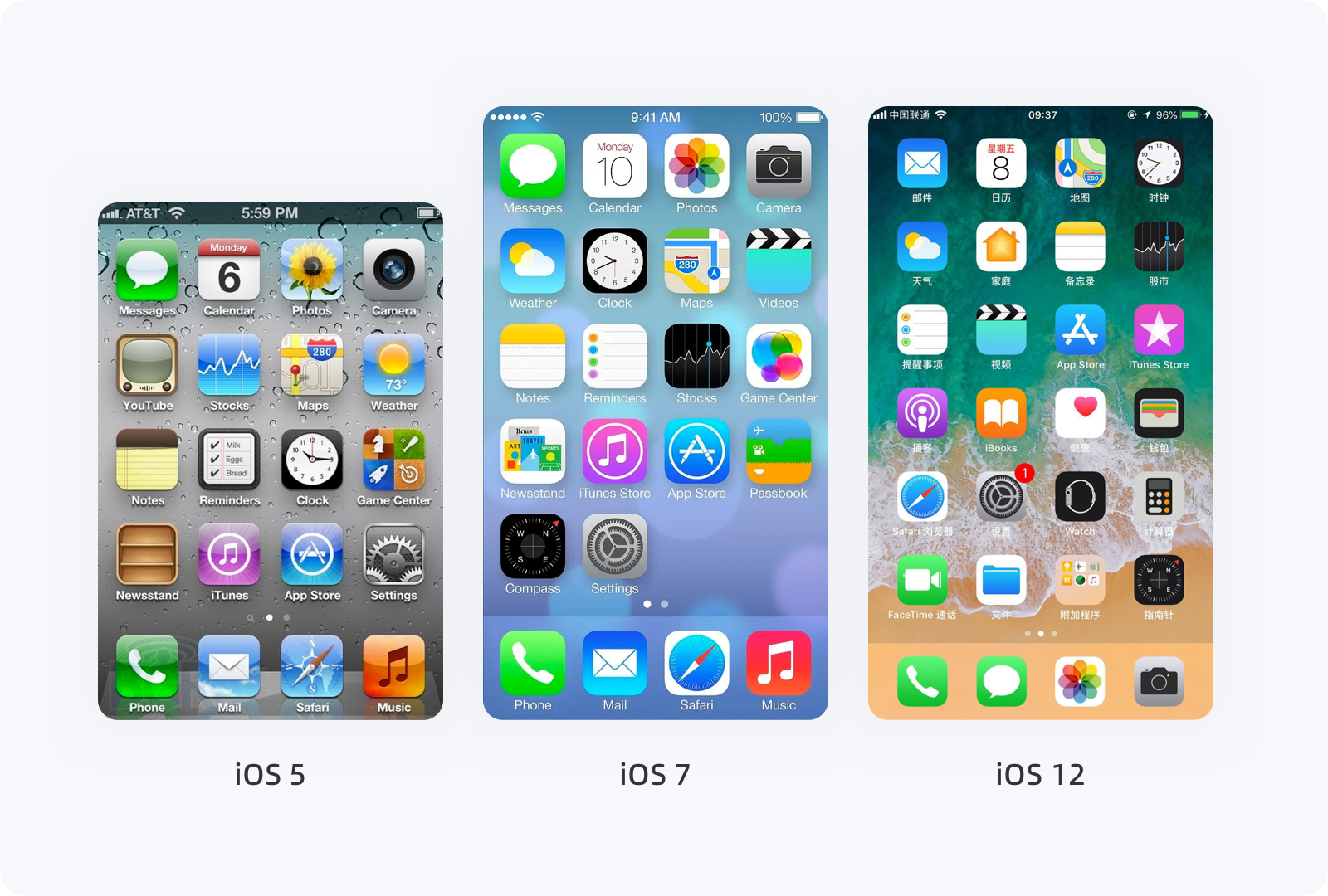 當(dāng)2007年 iPhone Runs OS X(iOS 1 系統(tǒng))出現(xiàn)時(shí),應(yīng)用界面和操作上跟現(xiàn)在的系統(tǒng)很像,里面也有了郵件、日歷、照片、時(shí)鐘、文本、Safari、便箋等應(yīng)用。流暢的動(dòng)畫、多點(diǎn)觸控的交互方式、簡(jiǎn)潔的UI足以顛覆人們對(duì)于傳統(tǒng)意義上手機(jī)界面的認(rèn)識(shí)。隨后,iOS 系統(tǒng)每次新版本的出現(xiàn),都有一些變化,但與iOS 7 相比,就是小巫見大巫了。2013年,iOS 7 的發(fā)布,是迄今為止 iOS 系統(tǒng)史上設(shè)計(jì)風(fēng)格的最大一次升級(jí),UI設(shè)計(jì)由之前的擬物化轉(zhuǎn)向扁平化,整個(gè)系統(tǒng)外觀看起來十分簡(jiǎn)潔,新增的指紋解鎖、控制中心設(shè)置快速切換、中國(guó)人喜愛的九宮格輸入法,以及簡(jiǎn)化的圖標(biāo)、交互的過渡動(dòng)畫等,基本上每一各元素都在根據(jù)用戶的操作及行為習(xí)慣發(fā)生變化。毫不夸張的說,iOS 7 系統(tǒng)改變了近十年的設(shè)計(jì)風(fēng)格,設(shè)計(jì)趨勢(shì)也正式從擬物化(復(fù)雜)時(shí)代走向扁平化(簡(jiǎn)約)時(shí)代。iOS 12 在設(shè)計(jì)上雖然沒有太大變化,但系統(tǒng)的流暢度相對(duì)提升了很多,例如相機(jī)啟動(dòng)速度提升70%、App啟動(dòng)速度提升40%,新增勿擾模式、密碼自動(dòng)填充等,包括后面 iOS 13 更加省電、面部解鎖速度提升、安裝包/更新包內(nèi)層變小等,無一不是在將事情變的更簡(jiǎn)單、更容易。