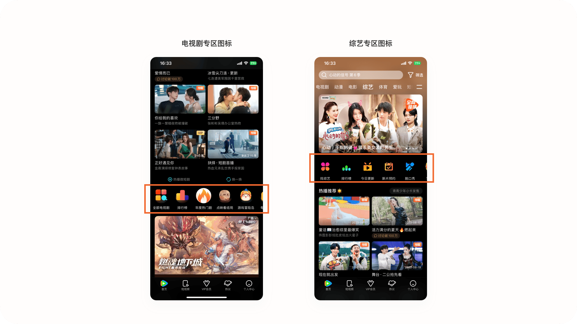 2.2.5設(shè)計(jì)誤區(qū):分區(qū)中的入口icon設(shè)計(jì)電視劇作為騰訊視頻的高頻點(diǎn)擊分區(qū),在頭部的icon確實(shí)有失大廠風(fēng)范,圖標(biāo)過大、視覺比例不一致、風(fēng)格不統(tǒng)一等問題,很影響界面的視覺美感,但入口的點(diǎn)擊轉(zhuǎn)化是否有影響未知。
