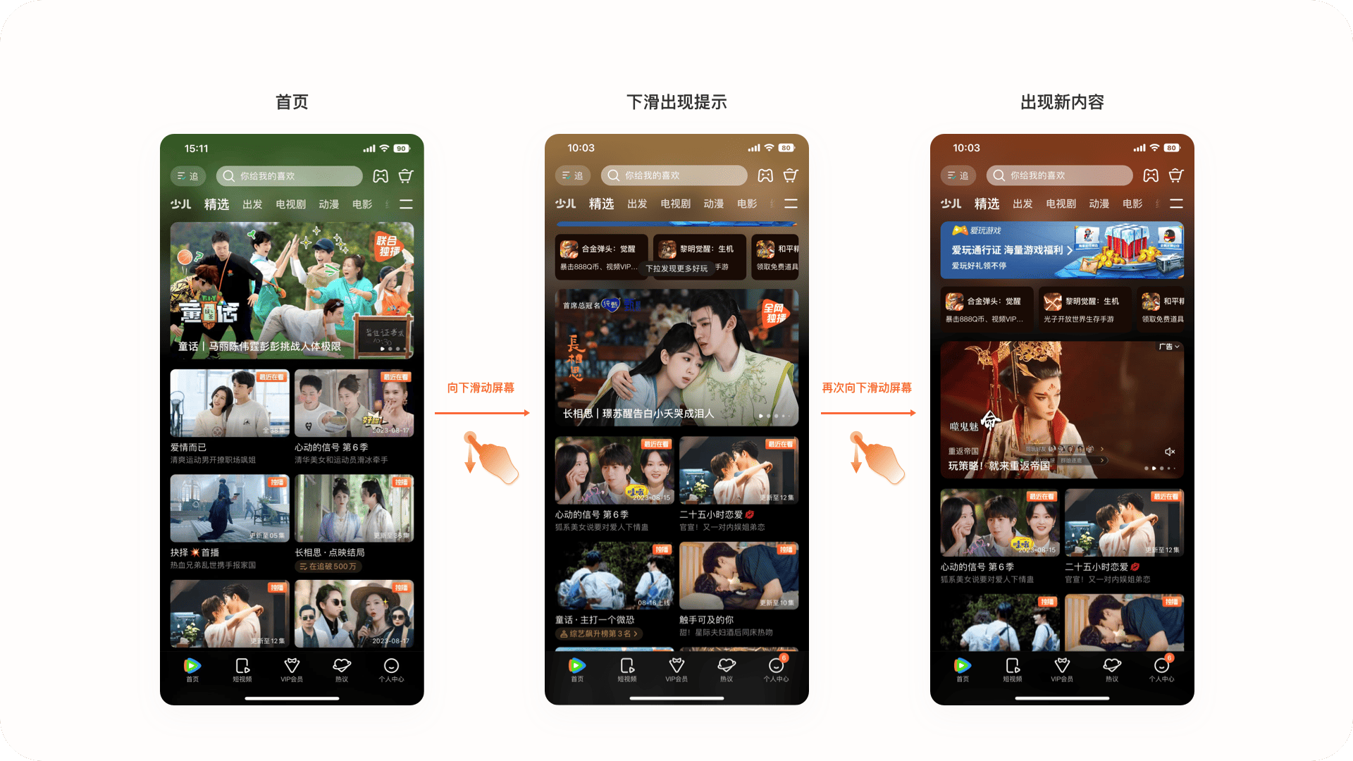 2.1.5設(shè)計(jì)亮點(diǎn):下拉刷新新玩法大多數(shù)產(chǎn)品下拉都為刷新界面操作,但騰訊視頻對下拉進(jìn)行兩部交互操作,用戶下拉到第一個(gè)階段會出現(xiàn)提示"下拉發(fā)現(xiàn)更多好玩"當(dāng)前這時(shí)用戶松手可以進(jìn)行常規(guī)刷新操作, 但用戶看到這樣的提示會更想知道在向下拉到會帶來怎么的內(nèi)容,當(dāng)用戶再次下拉后會出現(xiàn)對應(yīng)的內(nèi)容推薦,類似于游戲推廣與熱播劇推廣,賦予用戶驚喜感的同時(shí)還能增加廣告收入。