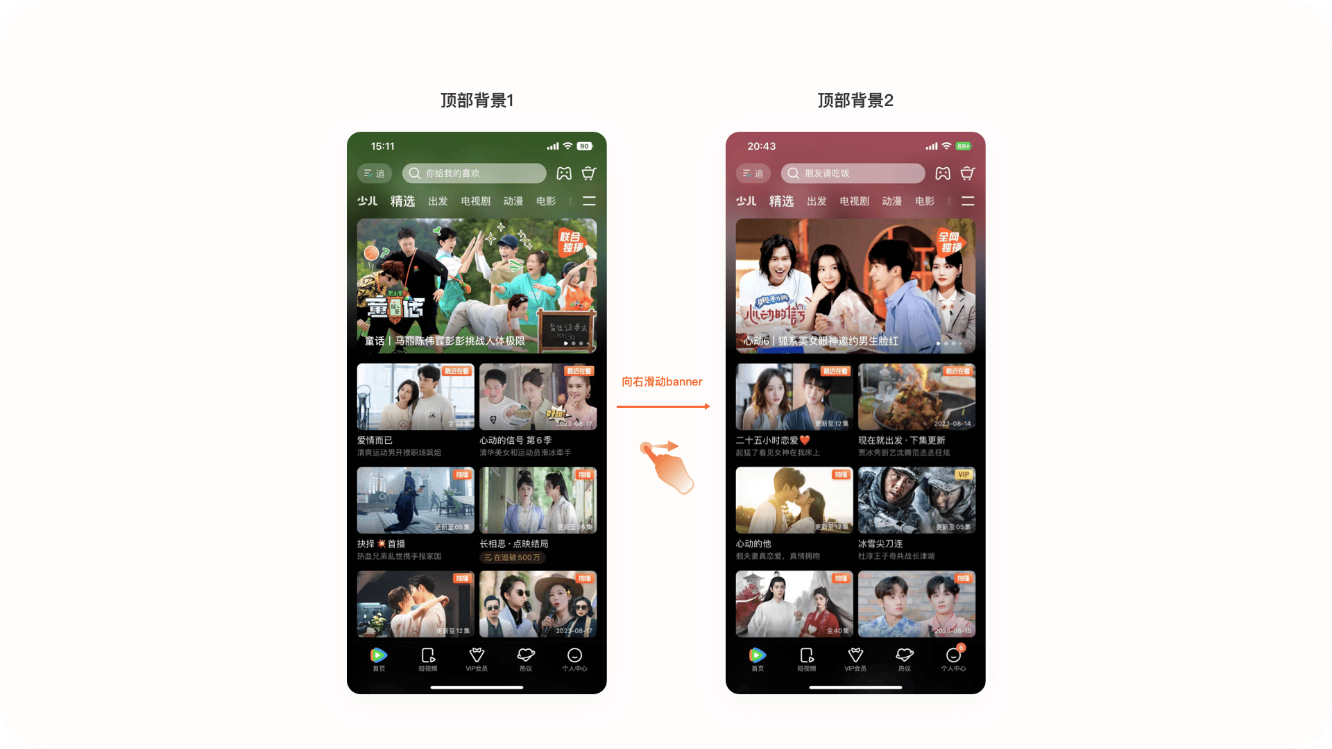2.1.4設(shè)計(jì)亮點(diǎn):頂部背景跟隨banner顏色進(jìn)行變化頂部背景跟隨banner進(jìn)行變化,當(dāng)用戶滑動(dòng)banner時(shí)頂部背景會跟隨banner的顏色進(jìn)行變化,這樣可以讓界面的配色看起來更加和諧,提升界面視覺一致性。同時(shí)賦予用戶體驗(yàn)驚喜感。
