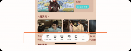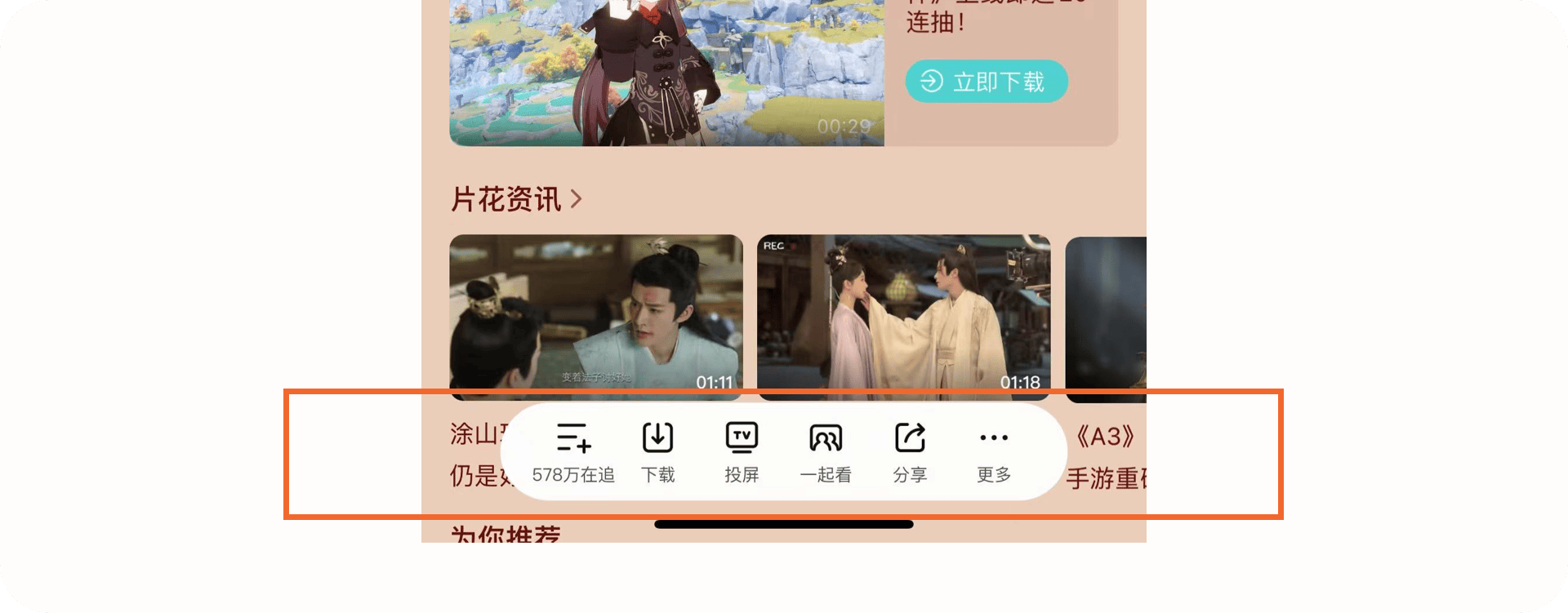 3.1.2產(chǎn)品亮點(diǎn):底部操作區(qū)功能相比其他產(chǎn)品,騰訊視頻在進(jìn)入豎屏播放頁后不會再頂部的視頻中默認(rèn)展示操作內(nèi)容,給用戶帶來更好的觀看體驗(yàn),并且把視頻相關(guān)的操作內(nèi)容放置底部做成一個(gè)底部操作區(qū),用戶可以在底部快速的對視頻進(jìn)行操作如:下載、投屏、一起看、分享等。而不是把功能分散在界面中,這樣不僅可以降低用戶的尋找這些高頻操作的成本,同時(shí)提升視頻的觀看體驗(yàn)。