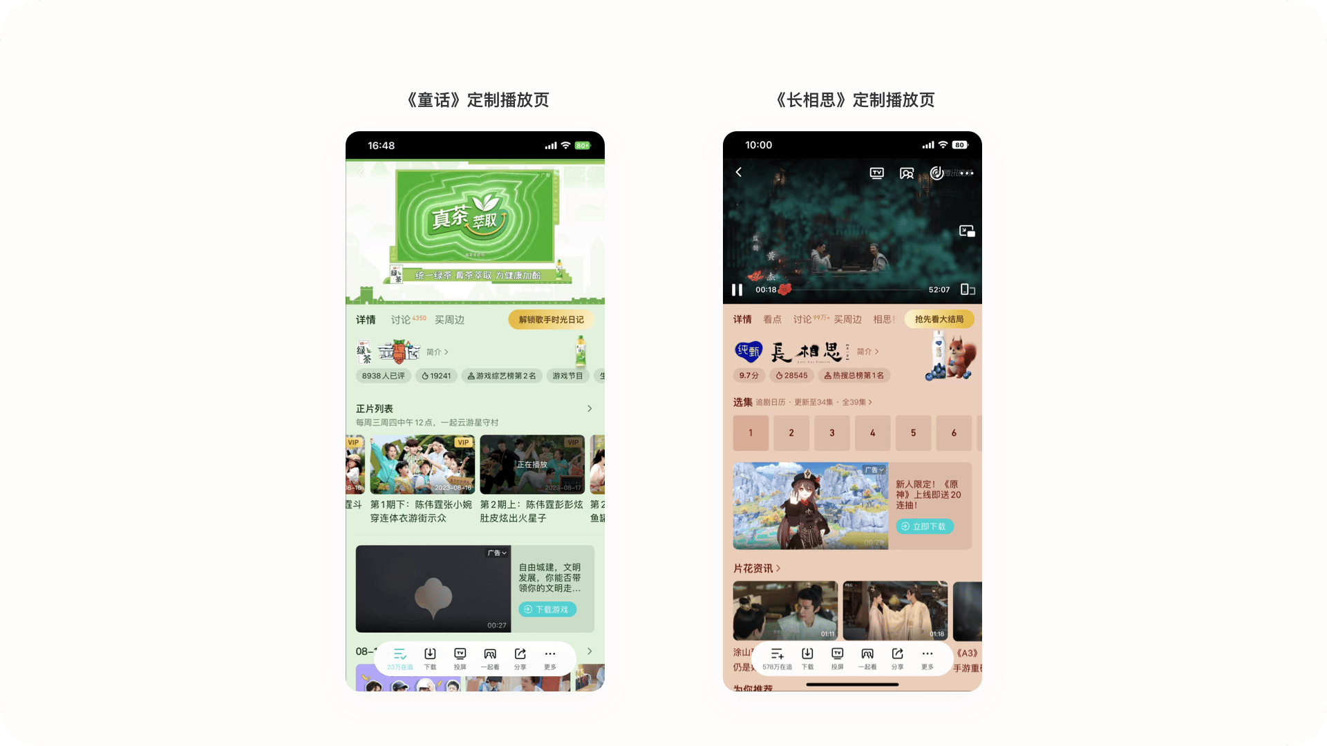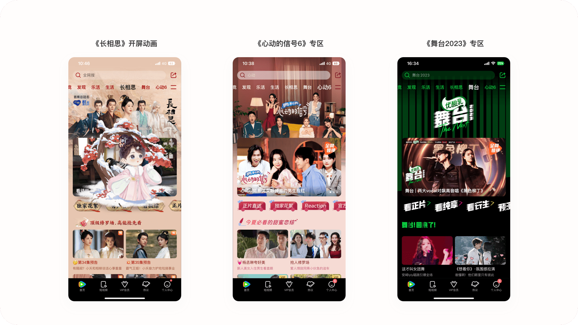 2.2.4設(shè)計(jì)亮點(diǎn):不一樣的定制化分區(qū)內(nèi)容頁騰訊視頻會根據(jù)站內(nèi)的熱門內(nèi)容進(jìn)行定制化分區(qū)內(nèi)容頁,雖然這種形式在各個(gè)視頻平臺都有設(shè)計(jì),但騰訊視頻的似乎更加與眾不同,它相比其他競品不僅增加了開屏動(dòng)畫,加強(qiáng)界面氛圍感,同時(shí)在功能上增加了一級標(biāo)題,如在長相思專題中的“獨(dú)家花絮、有聲書、看微綜、相思榜”等入口,可以讓用戶在頁面中發(fā)現(xiàn)更多劇情本身以外的衍生內(nèi)容,一級標(biāo)題的形式也可以讓用戶直達(dá)視頻播放頁,快速了解想要看到的視頻內(nèi)容。