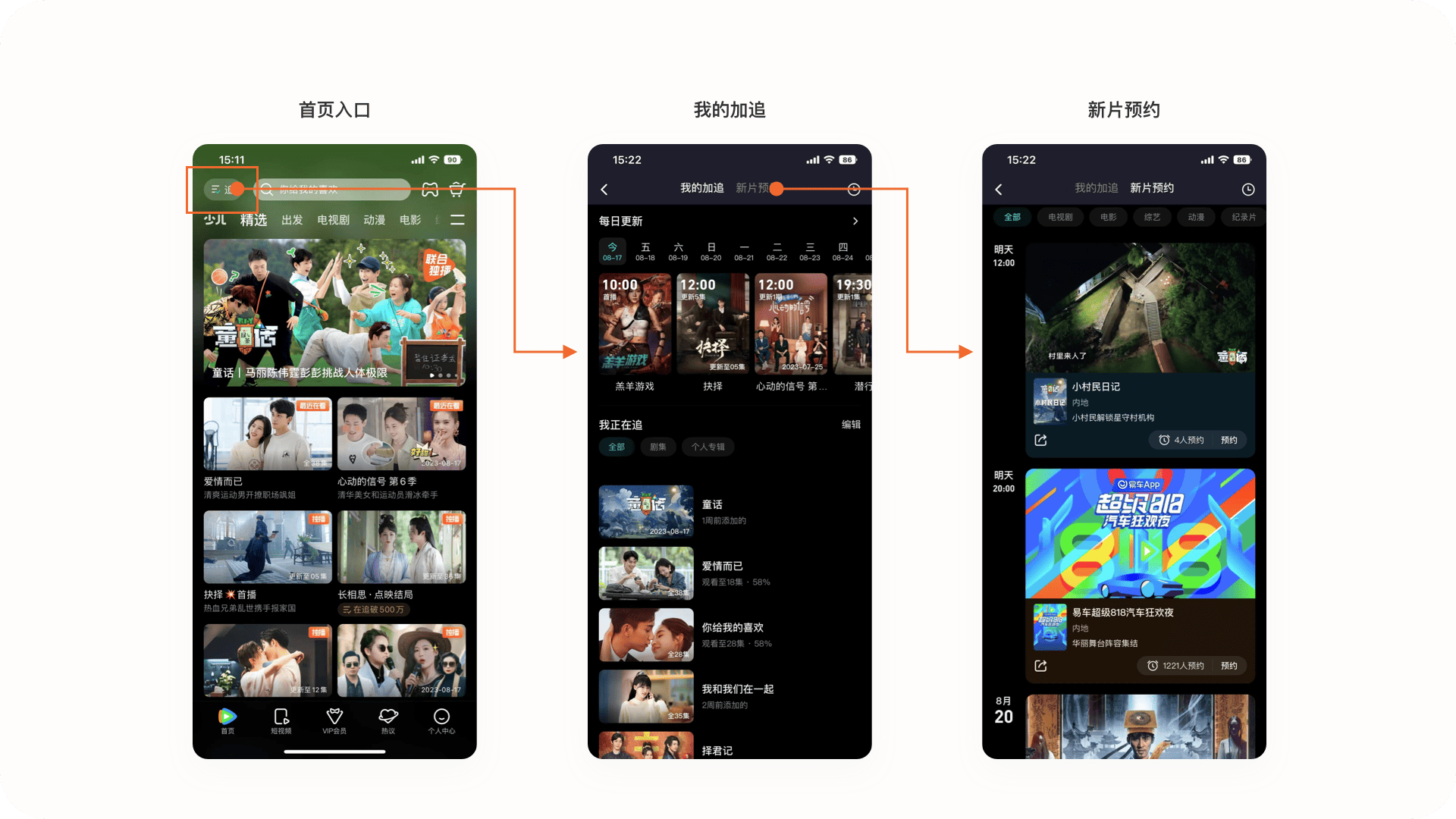 2.1.1產(chǎn)品亮點(diǎn):加追與預(yù)約功能在首頁左上角增加最近再追功能,此功能讓用戶在首頁就可以更快速的找到自己在追的內(nèi)容,而且在頁面中還包含新片預(yù)約和歷史瀏覽記錄功能,讓用戶在了解更多預(yù)約內(nèi)容與歷史記錄。此功能放在首頁很好的降低用戶操作成本,提升產(chǎn)品體驗(yàn)。