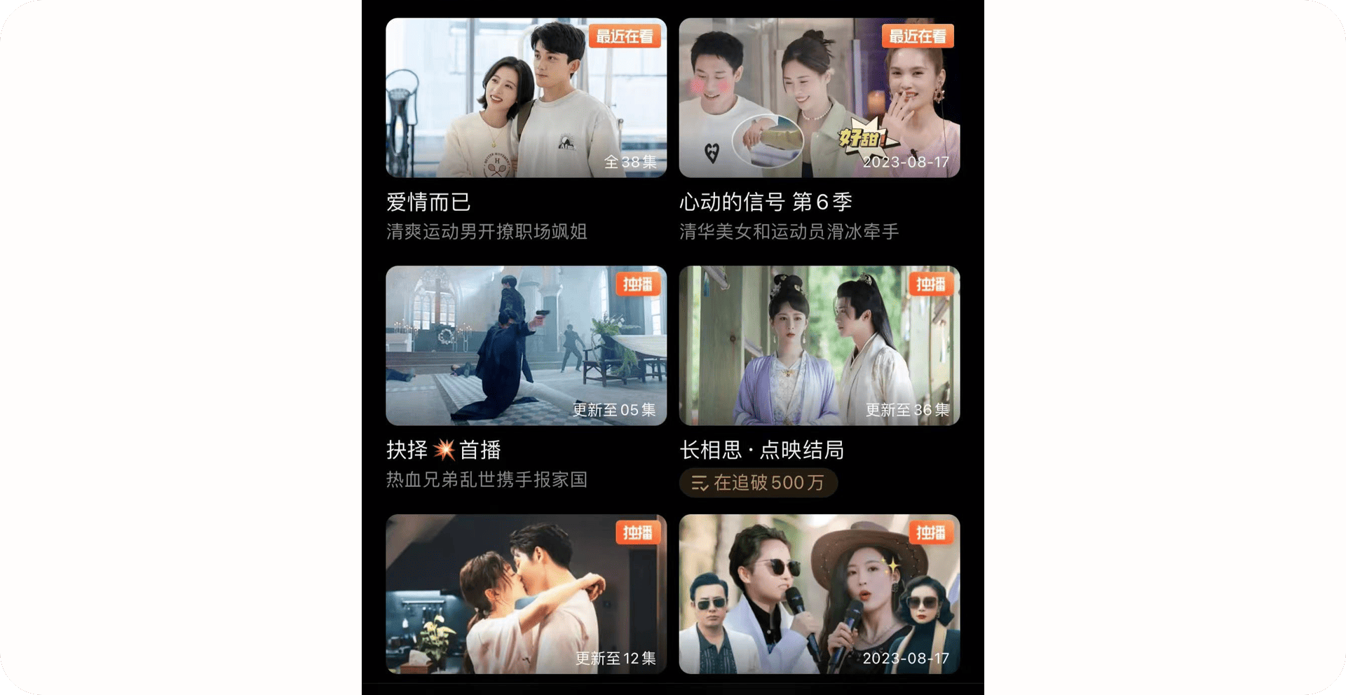 2.2.2產(chǎn)品亮點(diǎn):雙瀑布流推薦機(jī)制banner下方共6個(gè)雙瀑布流推薦位,這種排列方式可以在一屏中展示更多的信息,但不足就是如果界面全部都是這種排列方式會導(dǎo)致用戶瀏覽成本提高,降低用戶的瀏覽欲望,所以騰訊視頻把內(nèi)容控制在6個(gè),不會給用戶增加瀏覽負(fù)擔(dān),其次在推薦機(jī)制上對前兩個(gè)卡片進(jìn)行“最近在看”標(biāo)簽,和視頻預(yù)覽,相比其他靜態(tài)卡片可以讓用戶更加快速的發(fā)現(xiàn)自己想看的內(nèi)容。