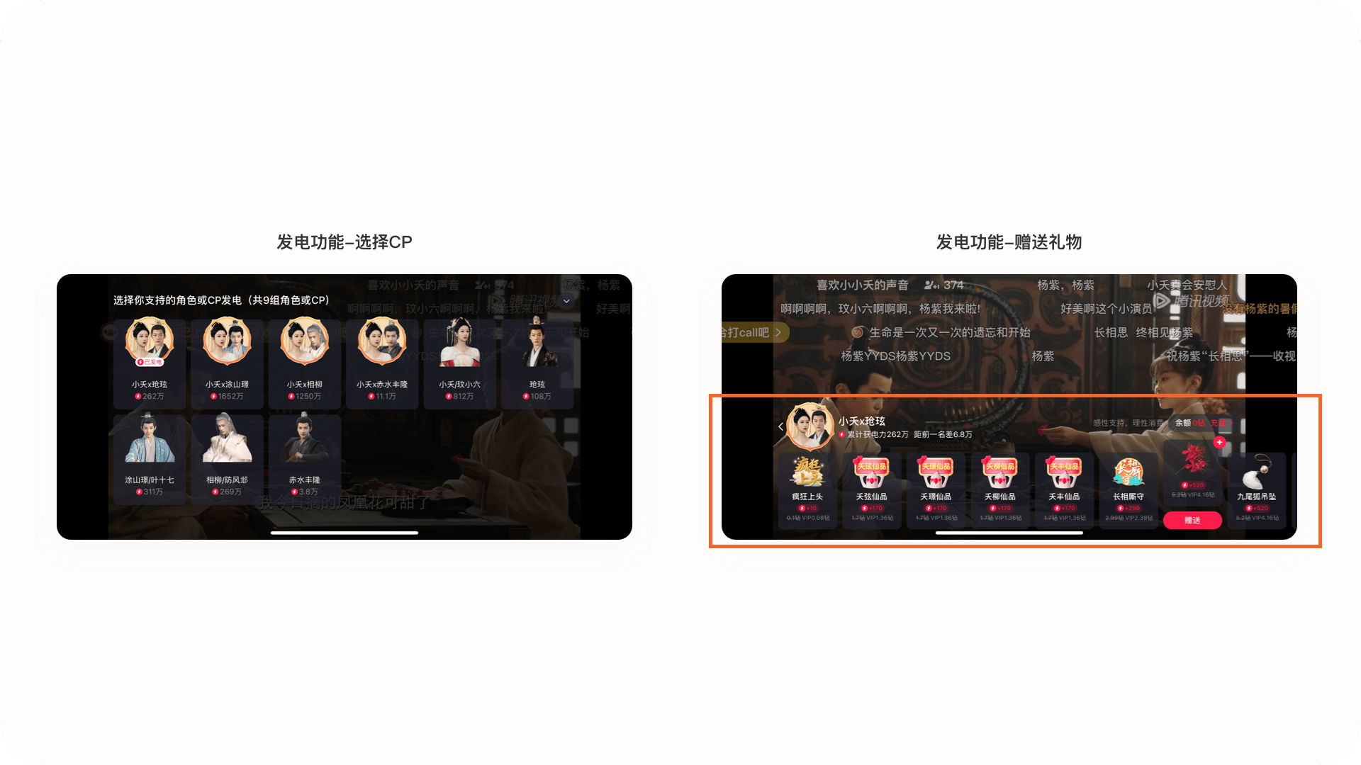 3.2.2產(chǎn)品亮點(diǎn):發(fā)電功能為自己支持的CP上分在底部操作區(qū)增加發(fā)電功能,用戶可以點(diǎn)擊為自己支持的cp送出禮物,不僅可以滿足用戶的“嗑CP”心理,同時(shí)對直播場景中的核心送禮功能很好的結(jié)合到視頻產(chǎn)品中,給視頻內(nèi)容提供了商業(yè)價(jià)值,提高產(chǎn)品收入。
