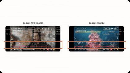 3.2.1設(shè)計(jì)亮點(diǎn):定制化進(jìn)度條與標(biāo)記糖點(diǎn)對應(yīng)熱門視頻內(nèi)容,騰訊視頻會定制化進(jìn)度條樣式與進(jìn)度點(diǎn)樣式,(如《長相思》中定制紅色木槿花)讓用戶更加沉浸的觀看體驗(yàn),同時(shí)在進(jìn)度條上方有標(biāo)記樣式,用戶點(diǎn)擊會觸發(fā)標(biāo)記動(dòng)效與糖點(diǎn),所有標(biāo)記的糖點(diǎn)數(shù)據(jù)也會以波動(dòng)圖的形式顯示在進(jìn)度條上方,提高互動(dòng)玩法。