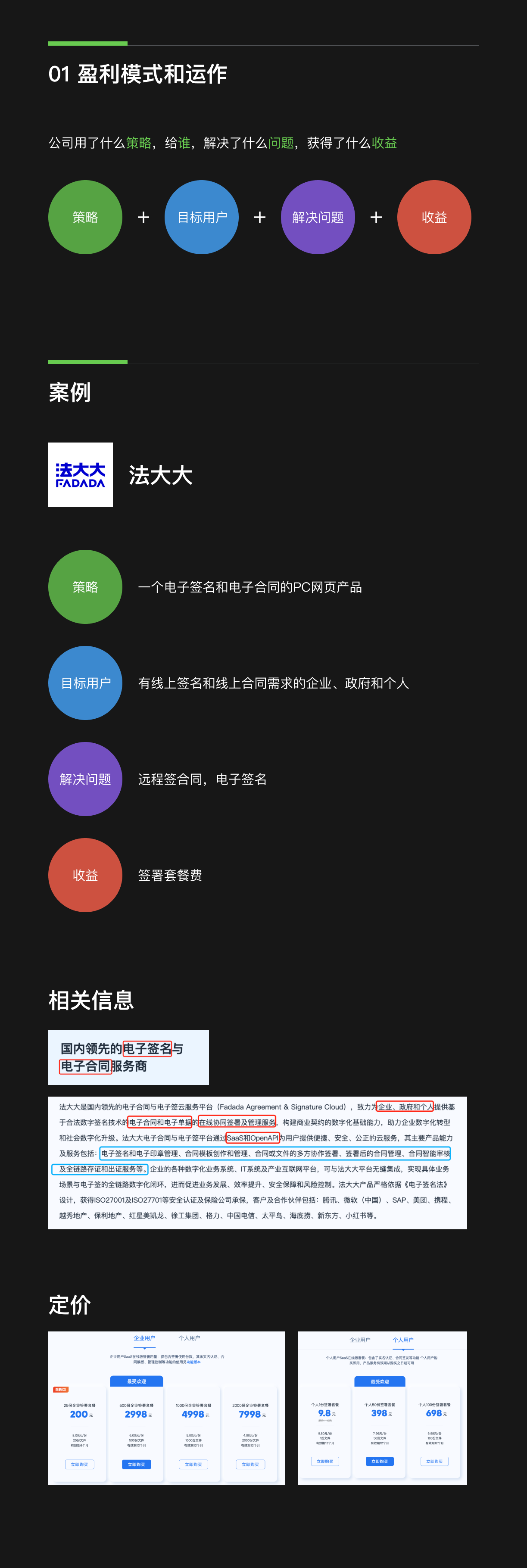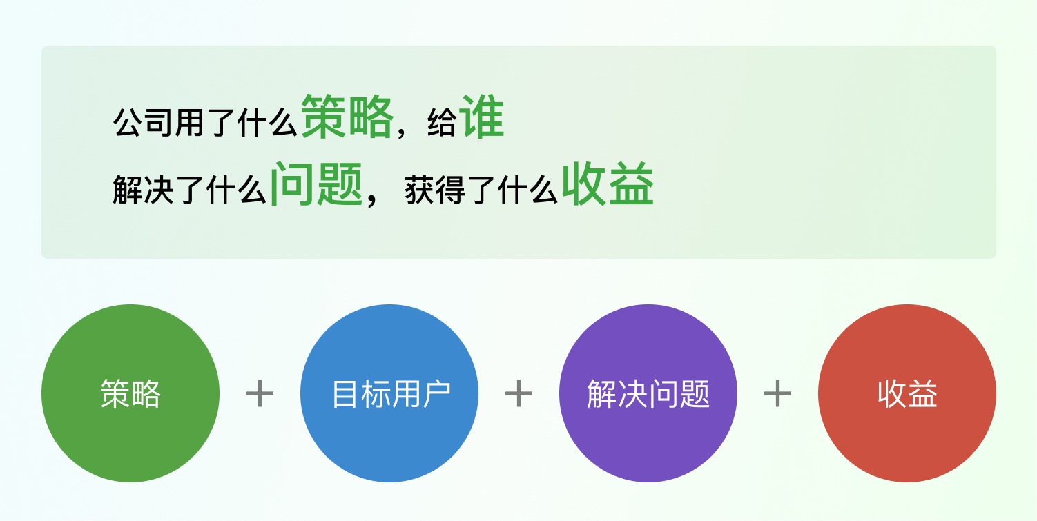 到此先做個小結(jié):① 了解公司盈利和運(yùn)作的公式:公司用了什么策略,給誰,解決了什么問題,獲得了什么收益