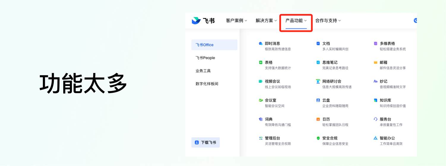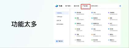 去哪里了解呢?一般企業(yè)官網(wǎng)都會把自家產(chǎn)品列出來,方便客戶查看,咱們也可以順著這條路線去走。就拿飛書舉例,從導(dǎo)航欄的“產(chǎn)品功能”我們可以看到,主要是四條線,咱們不用把每條線都挖得很細(xì)致,但是起碼要有大概的認(rèn)知,知道這是個什么東西,做什么的,最好上手體驗(yàn)體驗(yàn)。