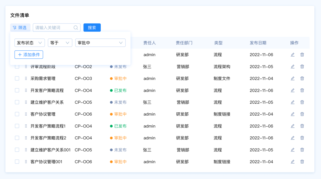 需求背景:客戶A想要快速篩選文件清單中發(fā)布狀態(tài)為“審批中”的數(shù)據(jù),能夠快速統(tǒng)計(jì)審批中的數(shù)據(jù)量,并且完成后續(xù)任務(wù)操作。