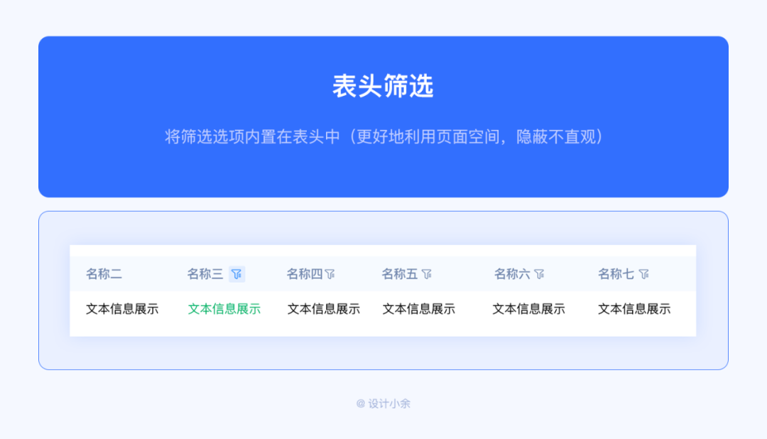 將篩選選項(xiàng)內(nèi)置在表頭中(更好地利用頁面空間,隱蔽不直觀)。當(dāng)頁面空間有限時(shí),可以考慮此方案。另外當(dāng)表格表頭字段數(shù)據(jù)較多時(shí),需要橫向滑動查看數(shù)據(jù)時(shí),建議還是直接將篩選條件單獨(dú)放在外面?;蛘弋?dāng)需要篩選的選項(xiàng)太多時(shí),表頭字段都能篩選時(shí),也可以考慮放在表頭中。