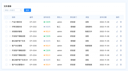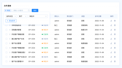 設(shè)計(jì)要點(diǎn):由于這里包含多種篩選類型,名稱和編號是關(guān)鍵詞篩選,發(fā)布狀態(tài)和、責(zé)任人、責(zé)任部門、類型是選項(xiàng)篩選,發(fā)布日期是時(shí)間區(qū)間篩選。所以我們需要采用組合篩選的模式。