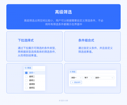 篩選條件自定義組合(靈活且占空間?。?。高級篩選占用空間比較小,用戶可以根據(jù)需要自定義篩選條件,不必將所有篩選條件都展示在界面中。使用更靈活,界面更美觀。