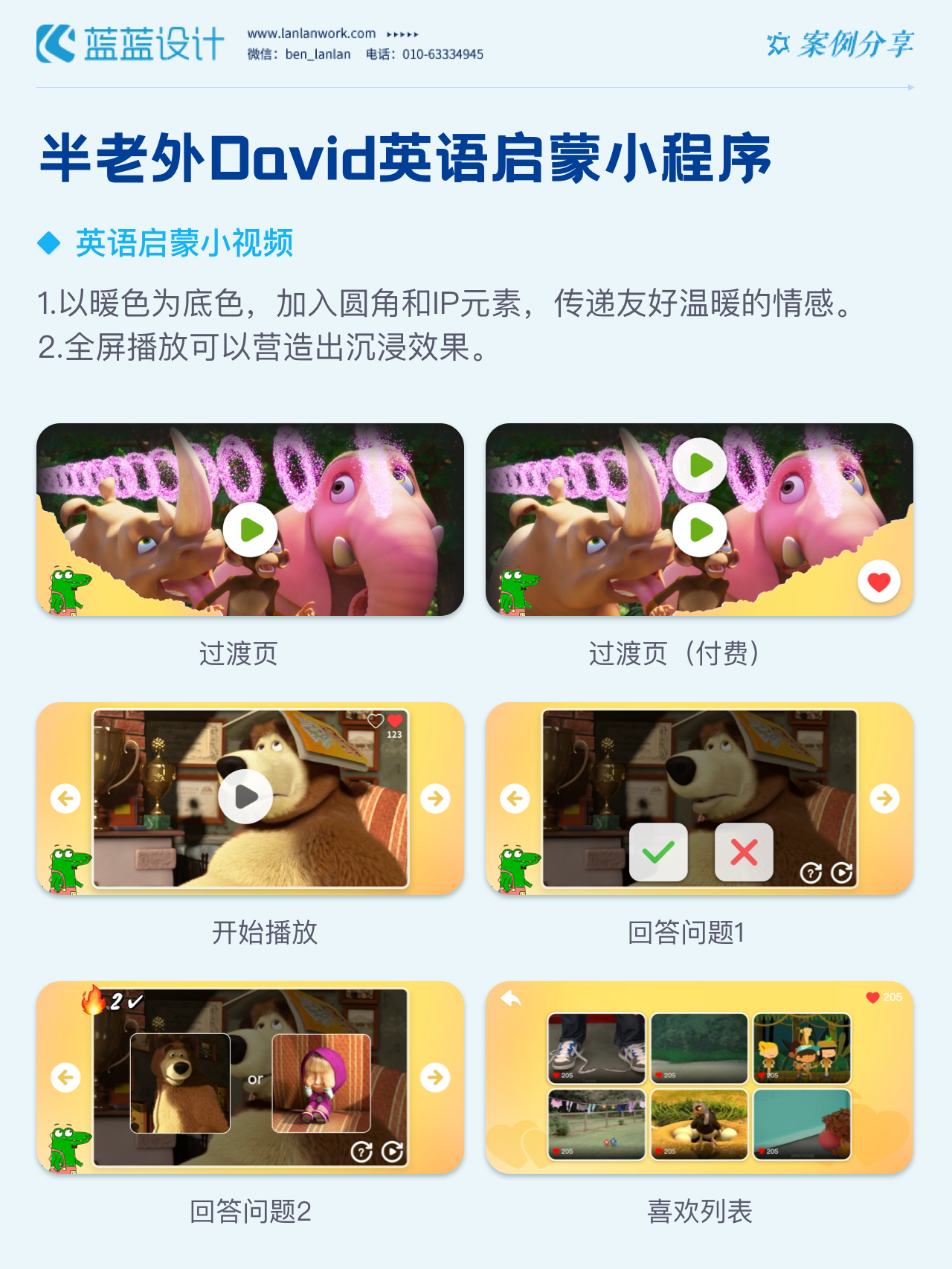 藍(lán)藍(lán)設(shè)計負(fù)責(zé)半老外David英語啟蒙小程序的界面整體風(fēng)格和細(xì)節(jié)優(yōu)化工作,也包括圖片優(yōu)化等諸多視覺內(nèi)容。前期雙方通過不斷溝通和深入了解最終確定了頁面的風(fēng)格樣式??匆曨l學(xué)英語的方式更容易為孩子所接受,頁面的簡潔風(fēng)格和顏色應(yīng)用更加吸引兒童。