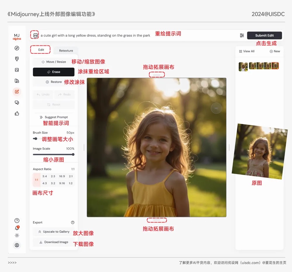 Edit(編輯)功能:支持局部重繪和外繪擴(kuò)展??梢酝磕ㄐ枰乩L的區(qū)域,并輸入提示詞進(jìn)行編輯。支持連續(xù)多次編輯,提高工作效率。