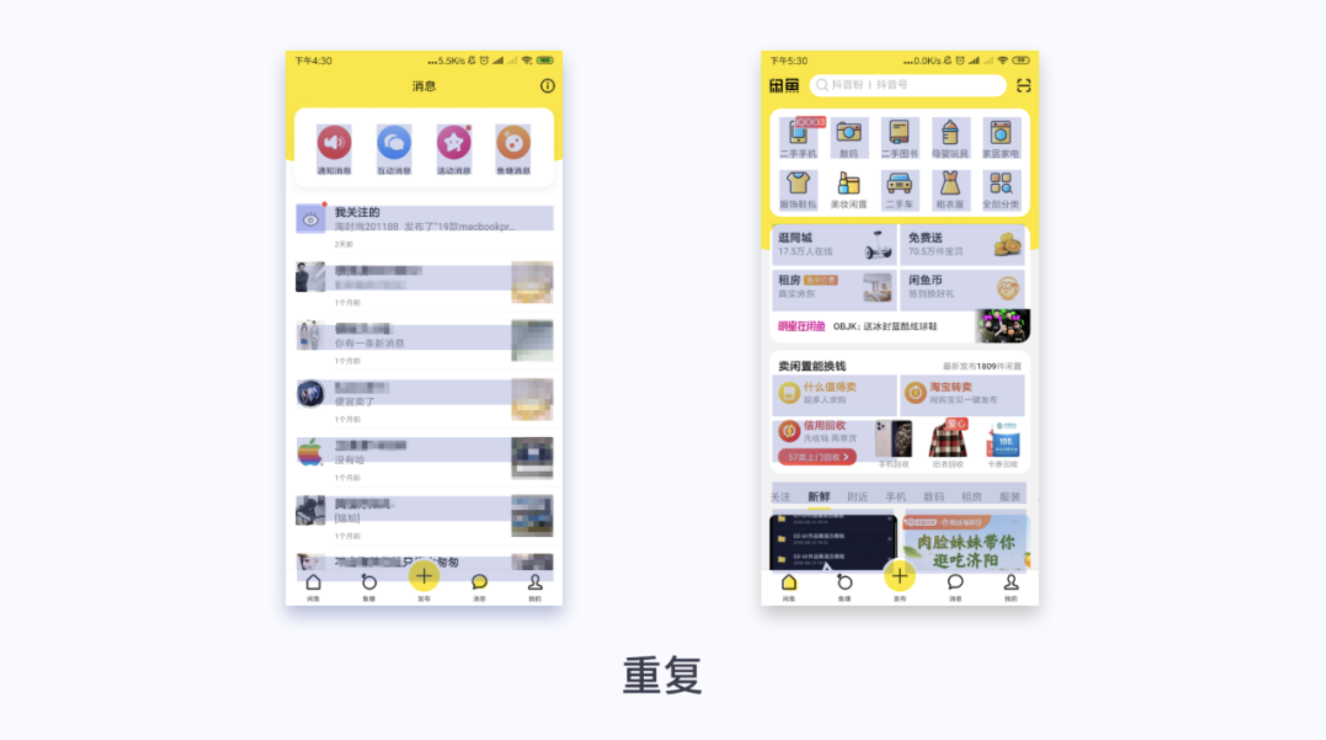 閑魚消息頁面,頭部功能區(qū)域圓形圖標(biāo)重復(fù),字體重復(fù)。消息列表頭像、名稱、消息、圖片重復(fù),保持一致性,和統(tǒng)一。