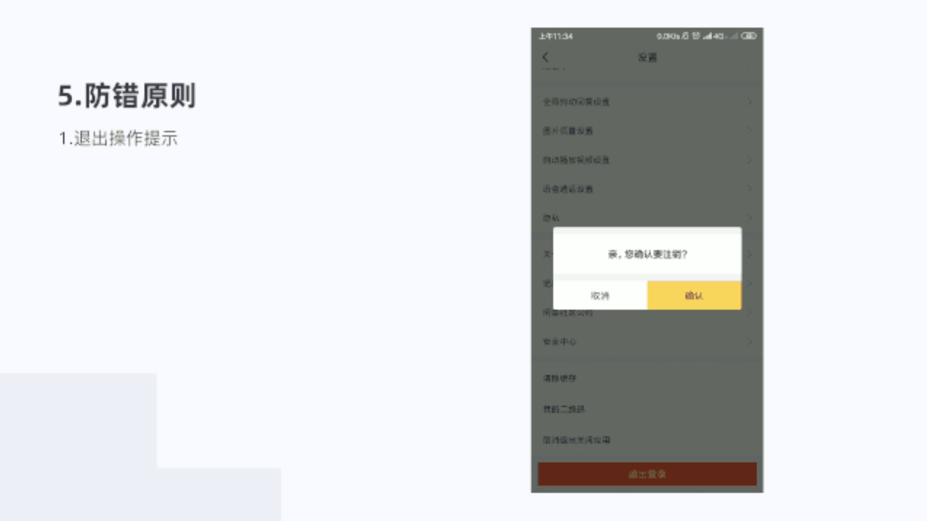在退出登錄提示是否要注銷登錄,把確認(rèn)層級加大,放在右邊,清晰提示用戶,防止用戶出錯