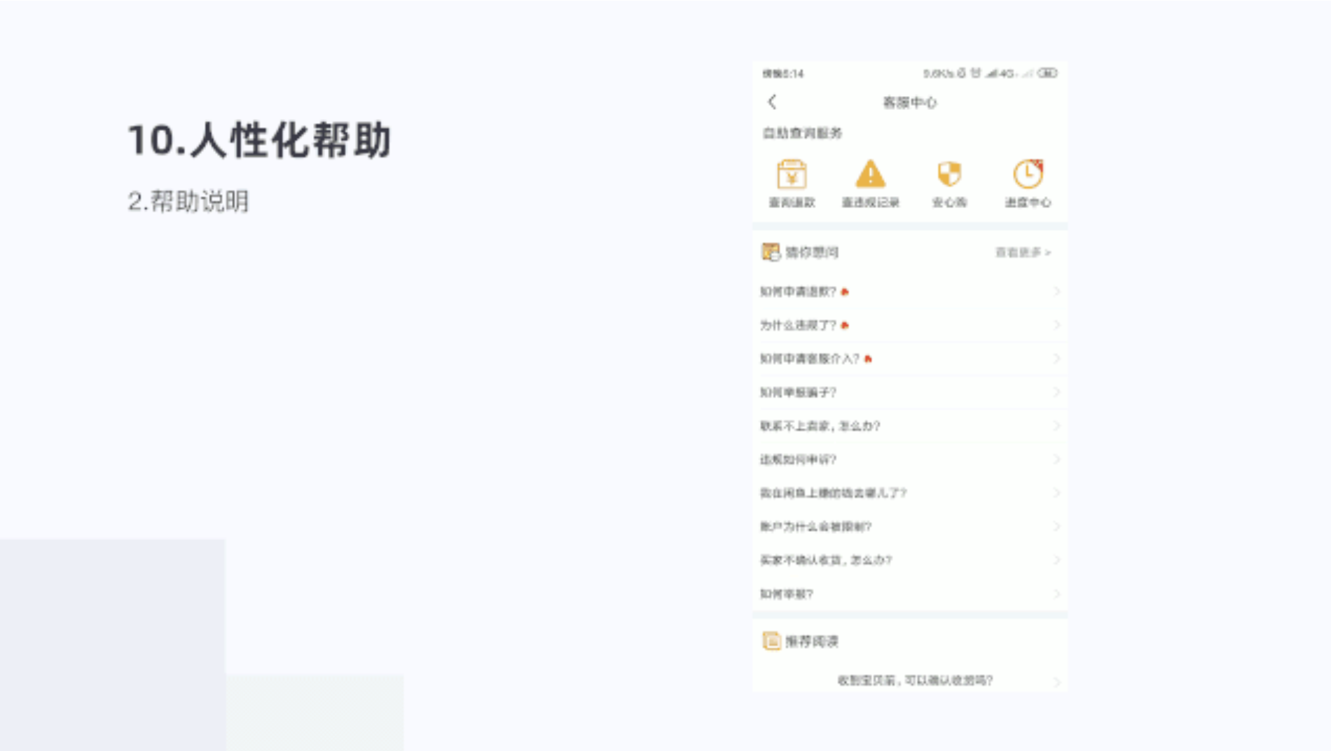 閑魚的幫助說明功能更加全面,滿足不用用戶場景的問題需求,也能及時和客戶進(jìn)行咨詢反饋信息。