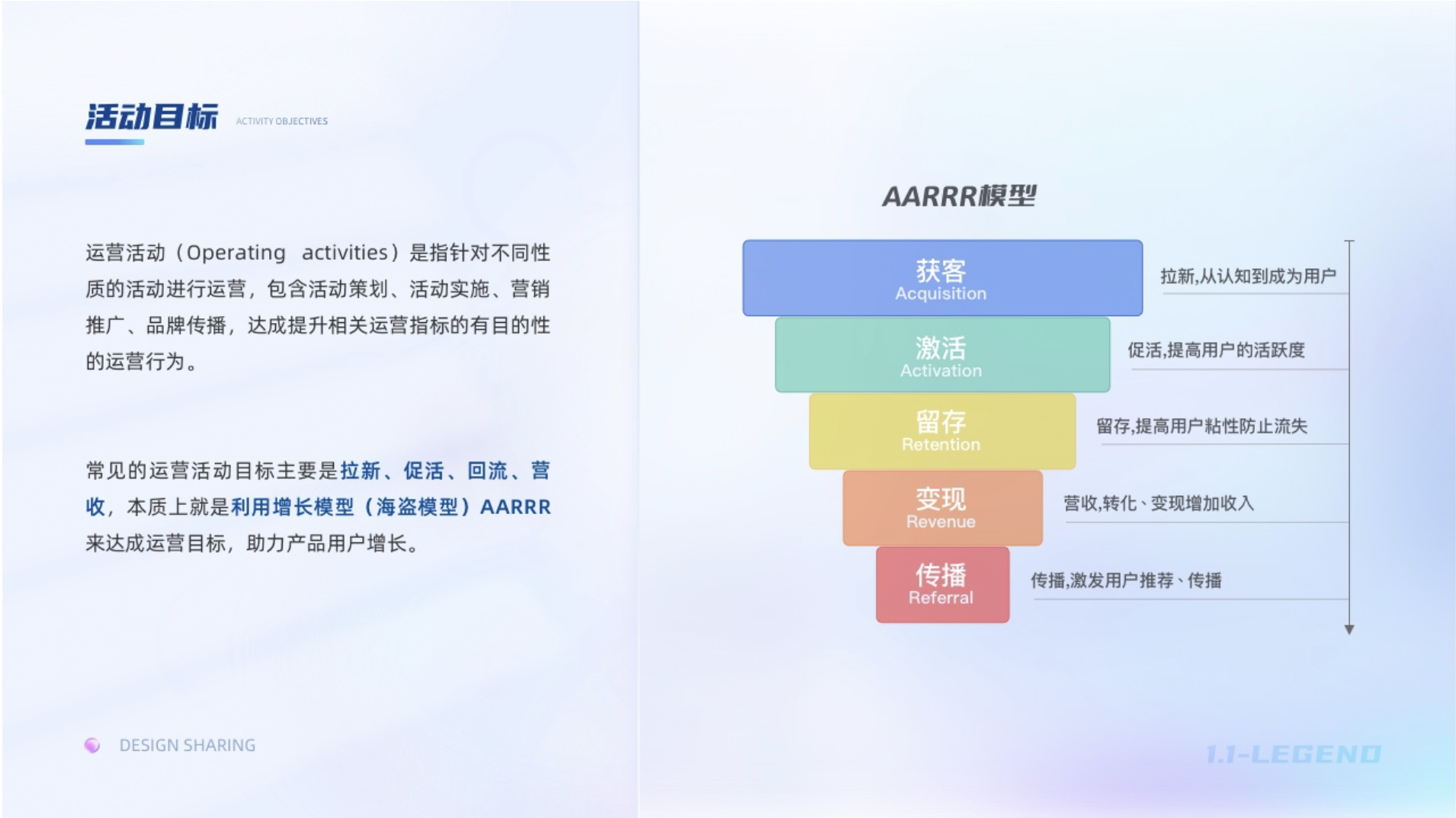 運營活動(Operating activities)是指針對不同性質(zhì)的活動進(jìn)行運營,包含活動策劃、活動實施、營銷推廣、品牌傳播,達(dá)成提升相關(guān)運營指標(biāo)的有目的的運營行為。為了更好的達(dá)成既定目標(biāo),項目立項后我們需要了解此次運營活動的目標(biāo),以目標(biāo)展開設(shè)計策略和設(shè)計實施。常見的運營活動目標(biāo)主要是拉新、促活、回流、營收,本質(zhì)上就是利用增長模型AARRR來達(dá)成運營目標(biāo),助力產(chǎn)品用戶增長。