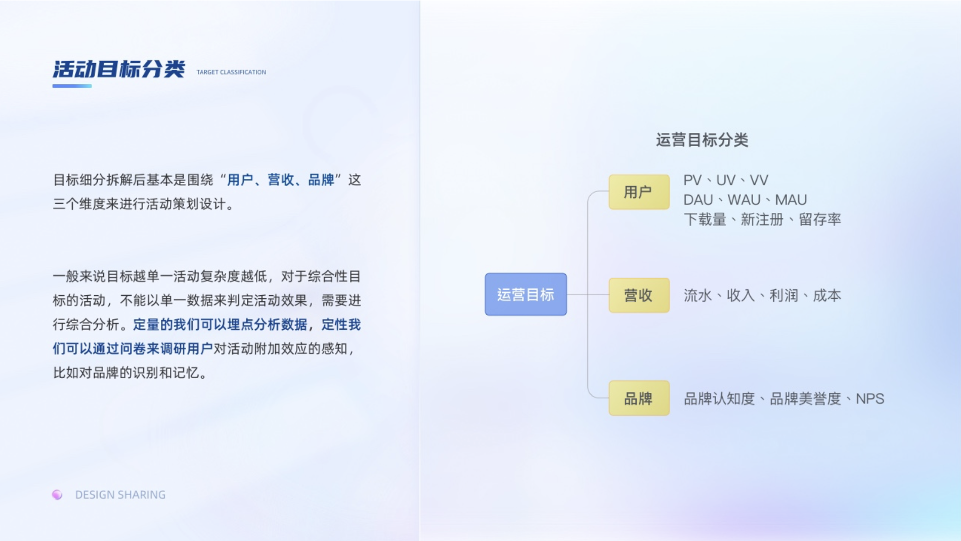 目標(biāo)的細(xì)分拆解后,基本都是圍繞“用戶、營收、品牌”這三個維度來進(jìn)行活動策劃設(shè)計。一般來說目標(biāo)越單一活動復(fù)雜度越低,目標(biāo)綜合性越高,越需要調(diào)動不同類型用戶參與,活動的復(fù)雜度就越高。對于綜合性目標(biāo)的活動,不能以單一數(shù)據(jù)來判定活動效果,需要進(jìn)行綜合分析。定量的我們可以埋點分析數(shù)據(jù),定性我們可以通過問卷來調(diào)研用戶對活動附加效應(yīng)的感知,比如對品牌的識別和記憶以及NPS(凈推薦值)。