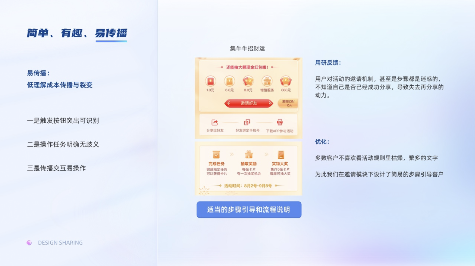 易傳播:是指低理解成本傳播與裂變。一是觸發(fā)按鈕突出可識別;二是操作任務(wù)明確無歧義;三是傳播交互易操作。通常我們設(shè)計的時候會理所當(dāng)然感覺用戶是很明確他們的操作行為的,但是基于某證券一期的活動用研反饋,用戶對活動的邀請機(jī)制,甚至是步驟都是迷惑的,不知道自己是否已經(jīng)成功分享,導(dǎo)致失去再分享的動力,為此我們在邀請模塊下設(shè)計了簡易的步驟去引導(dǎo)客戶。