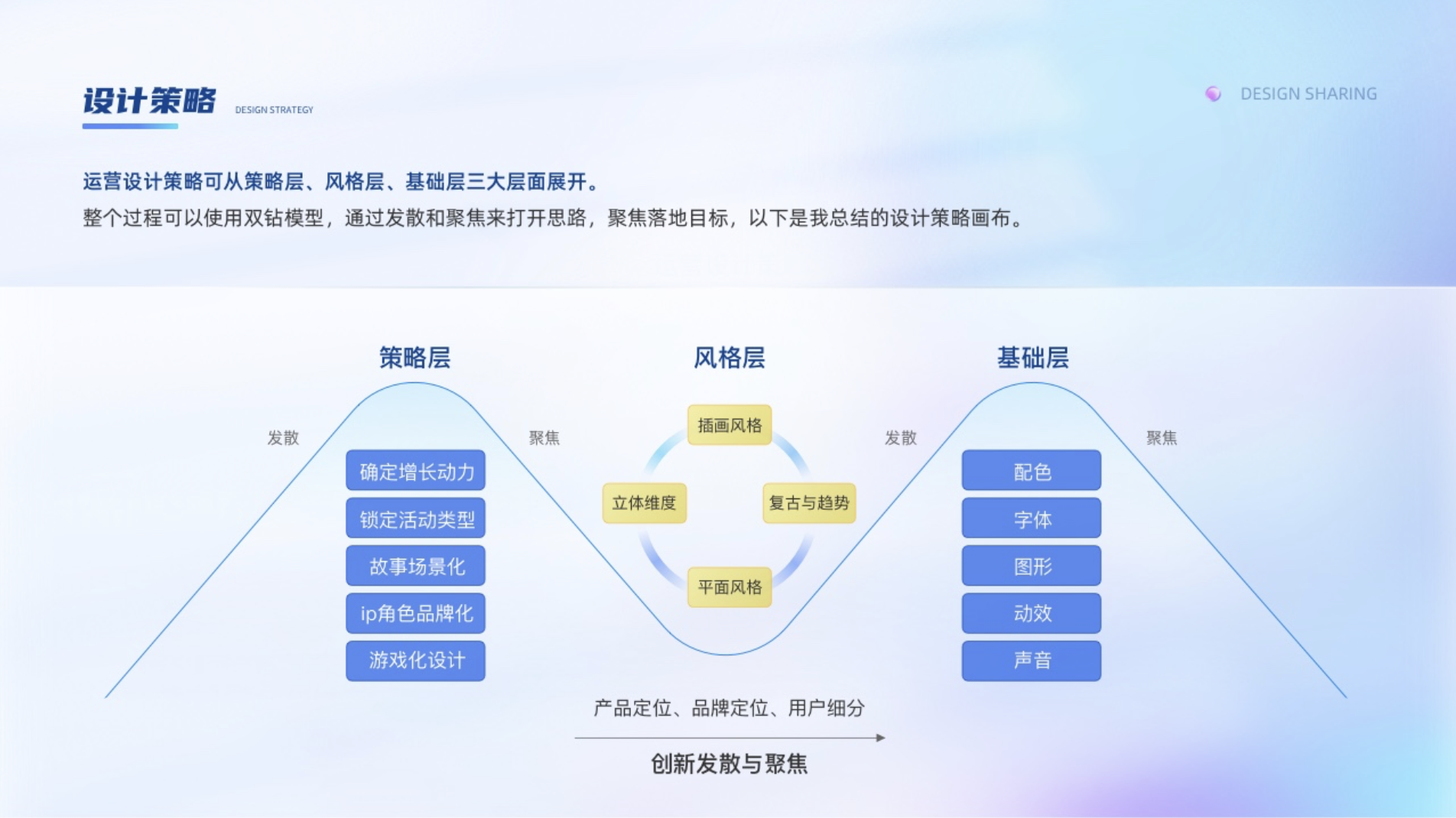 運營設(shè)計策略可從策略層、風(fēng)格層、基礎(chǔ)層三大層面展開。整個過程可以使用雙鉆模型,通過發(fā)散和聚焦來打開思路,聚焦落地目標(biāo),以下是我總結(jié)的設(shè)計策略畫布。