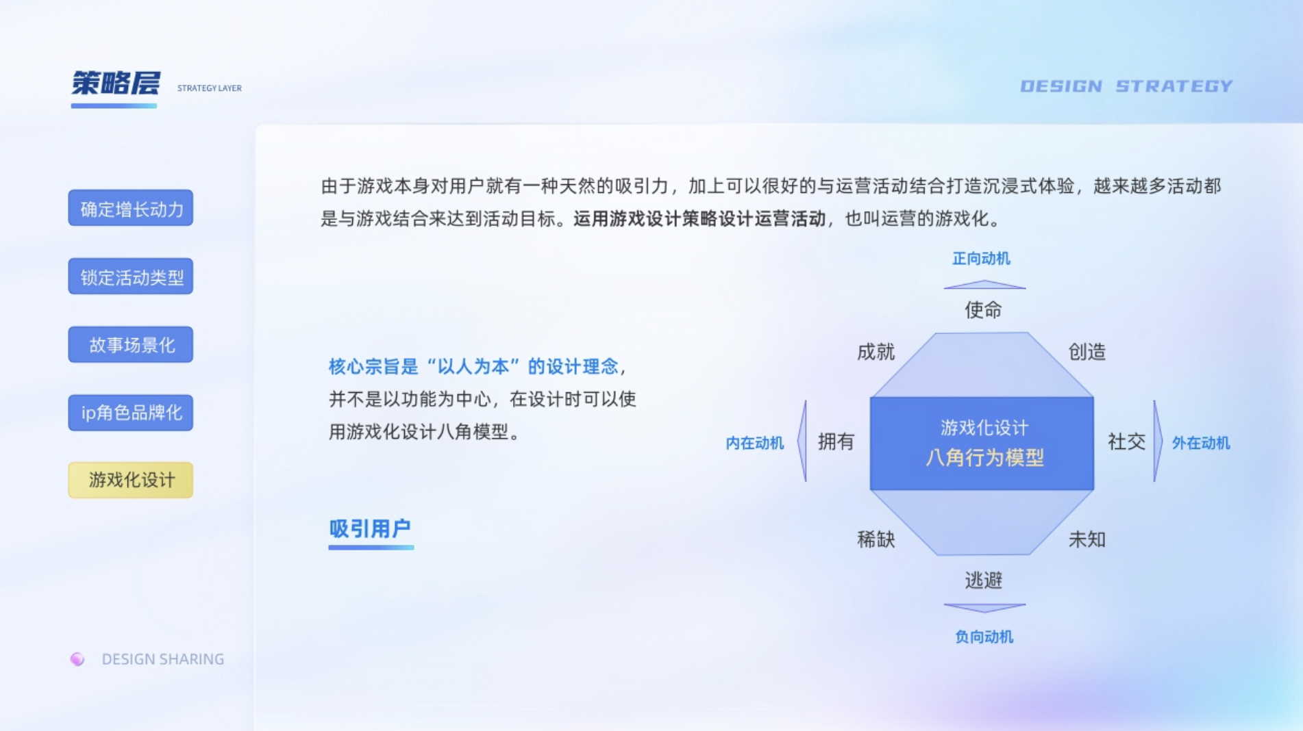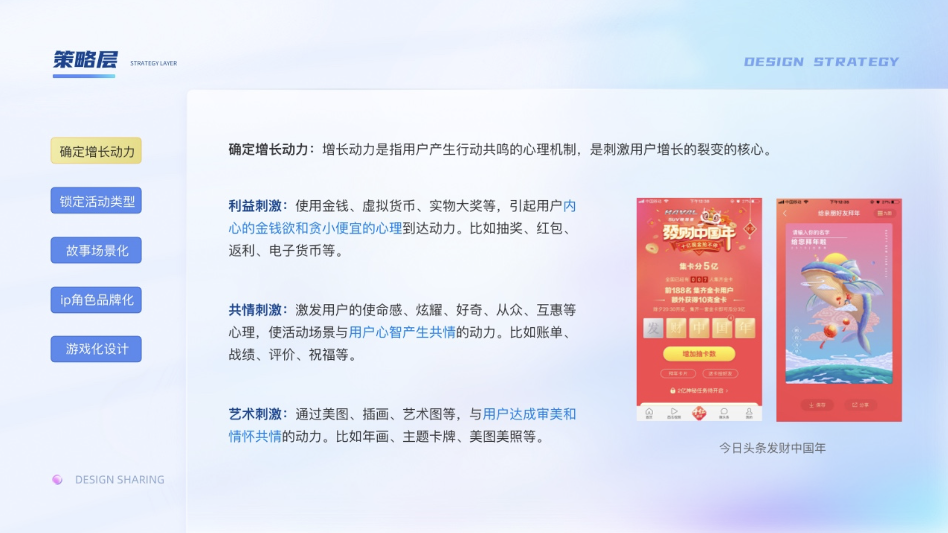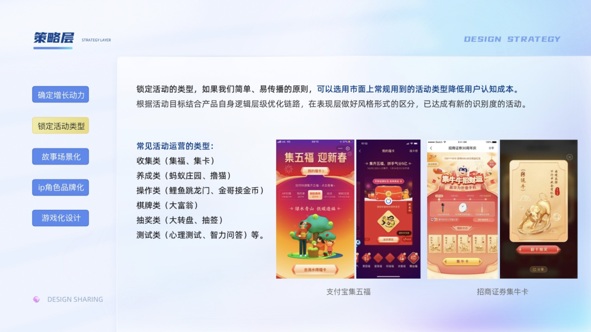 策略層:1、確定增長動力;2、鎖定活動類型;3、故事場景化;4、IP角色品牌化;5、游戲化設(shè)計