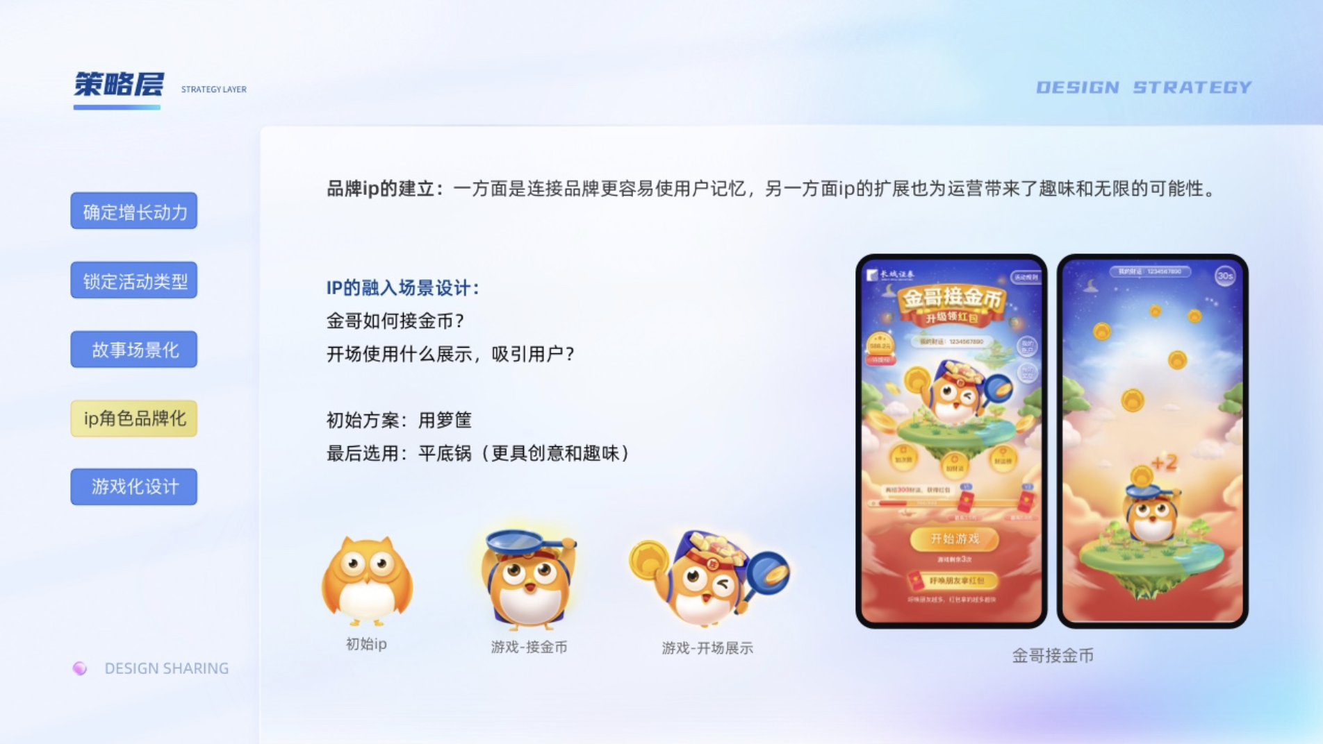 現(xiàn)在幾乎每個產(chǎn)品都有自己的ip,一方面是連接品牌更容易使用戶記憶,另一方面ip的擴(kuò)展也為運營帶來了趣味和無限的可能性。ip的使用一是要保證ip的識別性,另一方便是需要很好的融入我們的故事場景。比如金哥他出現(xiàn)在我們接金幣的場景需要什么樣的裝束,使用什么動作更好的連接到這個接金幣的故事場景中。一開始想著用籮筐去接金幣,但是籮筐體積大而高,會擋住ip,降低了ip的識別度。在設(shè)計的過程中突然靈光一閃,為了什么不用平底鍋呢,它除了打人,接金幣也不錯。通過金哥頭頂平底鍋的接金幣方式,增添了整個游戲的創(chuàng)新性和趣味性,至于籮筐可以收納平底鍋接到的金幣,整個場景就很有邏輯性和畫面感了。同時為了凸顯游戲的氛圍,還給ip設(shè)計了頭帶必勝的綁帶的小細(xì)節(jié),和有沖擊力的動作,增添了ip的生命力。