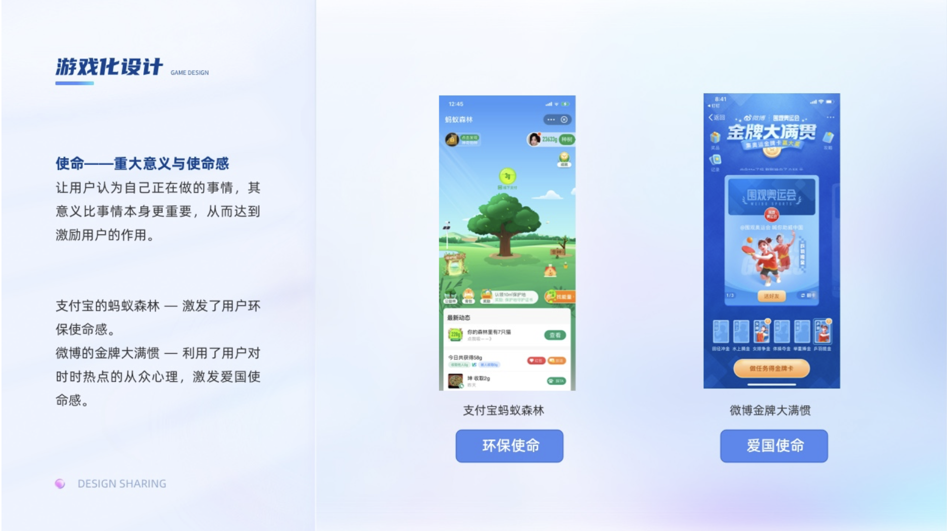 讓用戶認(rèn)為自己正在做的事情,其意義比事情本身更重要,從而達(dá)到激勵用戶的作用。譬如支付寶里面的螞蟻森林,種的不是樹,而是地球的一點綠,這個使命感瞬間油然而生,在玩的過程中還能幫助地球綠化,激發(fā)了用戶環(huán)保使命感。再比如在奧運期間的微博的金牌大滿慣的活動,以圍觀奧運會之名,集奧運金牌卡喊你助威中國,利用了用戶對時時熱點的從眾心理,又聯(lián)系到了愛國上升了到了愛國使命感。