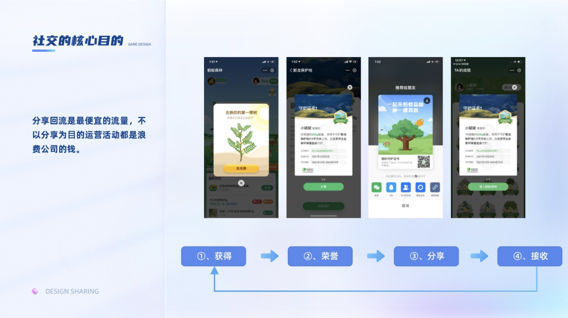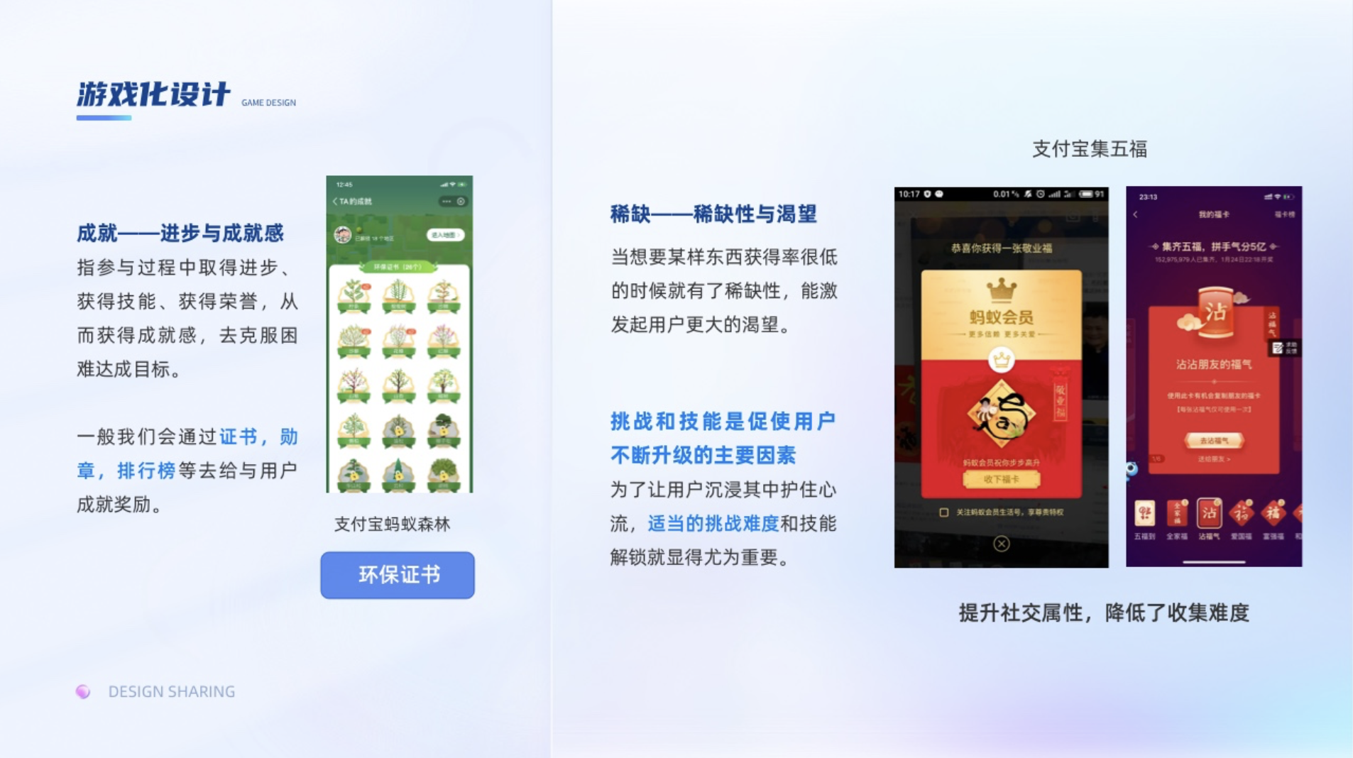 指參與過程中取得進(jìn)步、獲得技能、獲得榮譽,從而獲得成就感,去克服困難達(dá)成目標(biāo)。一般我們會通過證書,勛章,排行榜等去給與用戶成就獎勵。挑戰(zhàn)和技能是促使用戶不斷升級的主要因素,為了讓用戶沉浸其中護(hù)住心流,適當(dāng)?shù)奶魬?zhàn)難度和技能解鎖就顯得尤為重要。挑戰(zhàn)難度高了容易引起用戶的焦慮,難度低了又會讓用戶感覺無聊。比如集卡行動,在考慮總預(yù)算不變的情況下,如何設(shè)置稀有卡的比例,集卡的難度就尤為重要。支付寶集五福在初期,敬業(yè)福的比例比較低,所以用戶抽到敬業(yè)福的體驗就很開心,但隨著支付寶后面為了擴(kuò)大社交屬性,提高了集齊率,集五到五福的興奮感就弱了,導(dǎo)致部分用戶失去動力,因為集到的人越多后續(xù)瓜分的錢就越少。