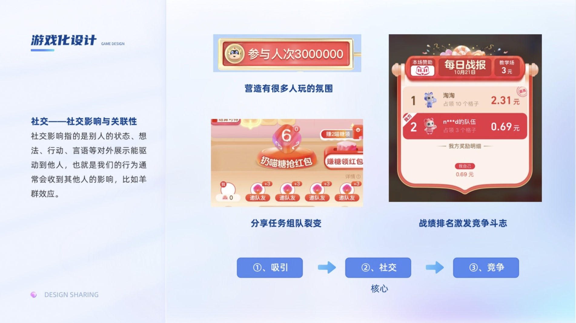 社交影響指的是別人的狀態(tài)、想法、行動、言語等對外展示能驅(qū)動到他人,也就是我們的行為通常會收到其他人的影響,比如羊群效應(yīng)。就像看抖音,點贊量多的,沒準(zhǔn)我們會跟有耐心看到最后,因為有個潛意識心理就是大家都覺得好,總之差不到哪里去。在游戲和運營活動中,營造有很多人玩的氛圍,鼓勵用戶炫耀自己的成果都是非常見效的方式。關(guān)聯(lián)性我理解為我們會選擇盡可能與我們有關(guān)聯(lián)的事物。比如拼多多推薦你去分享,都是優(yōu)先推薦與你互動最為頻繁的,這樣去拼單和拼單成功的幾率更高。