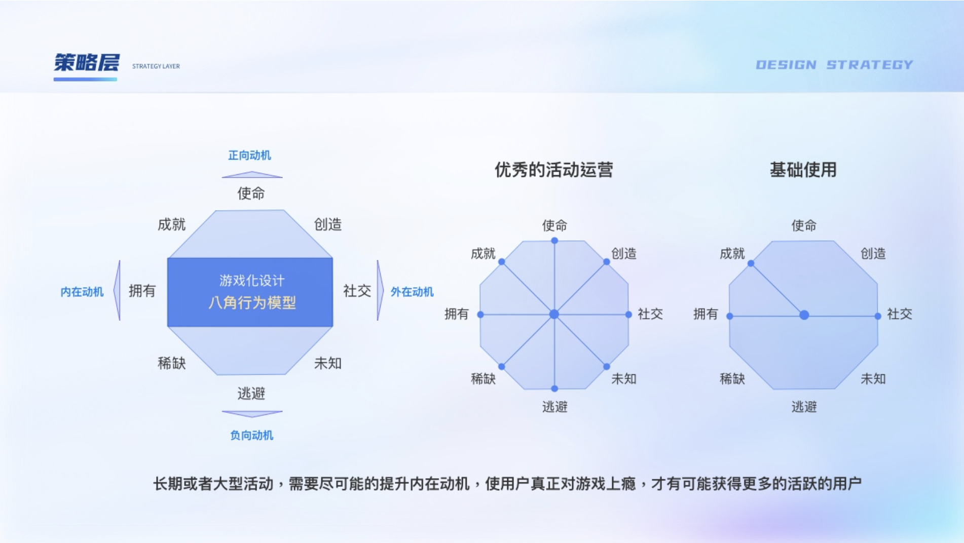 由于游戲本身對用戶就有一種天然的吸引力,加上可以很好的與運營活動結(jié)合打造沉浸式體驗,越來越多活動都是與游戲結(jié)合來達(dá)到活動目標(biāo),也叫運營的游戲化。核心宗旨是“以人為本”的設(shè)計理念,并不是以功能為中心,在設(shè)計時可以使用游戲化設(shè)計八角模型。