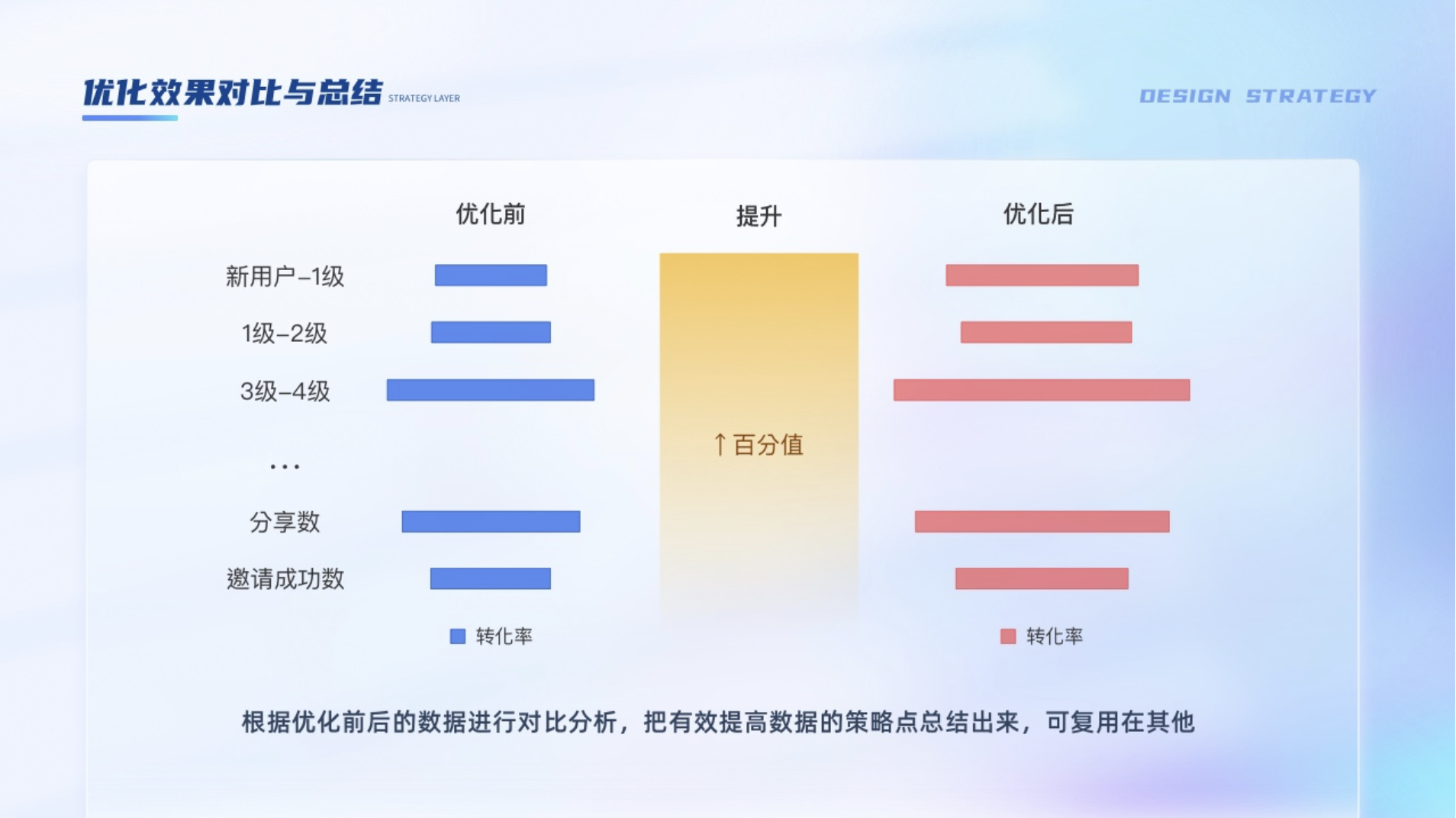 根據(jù)優(yōu)化前后的數(shù)據(jù)進(jìn)行對比分析,把有效提高數(shù)據(jù)的策略點總結(jié)出來,可復(fù)用在其他項目。