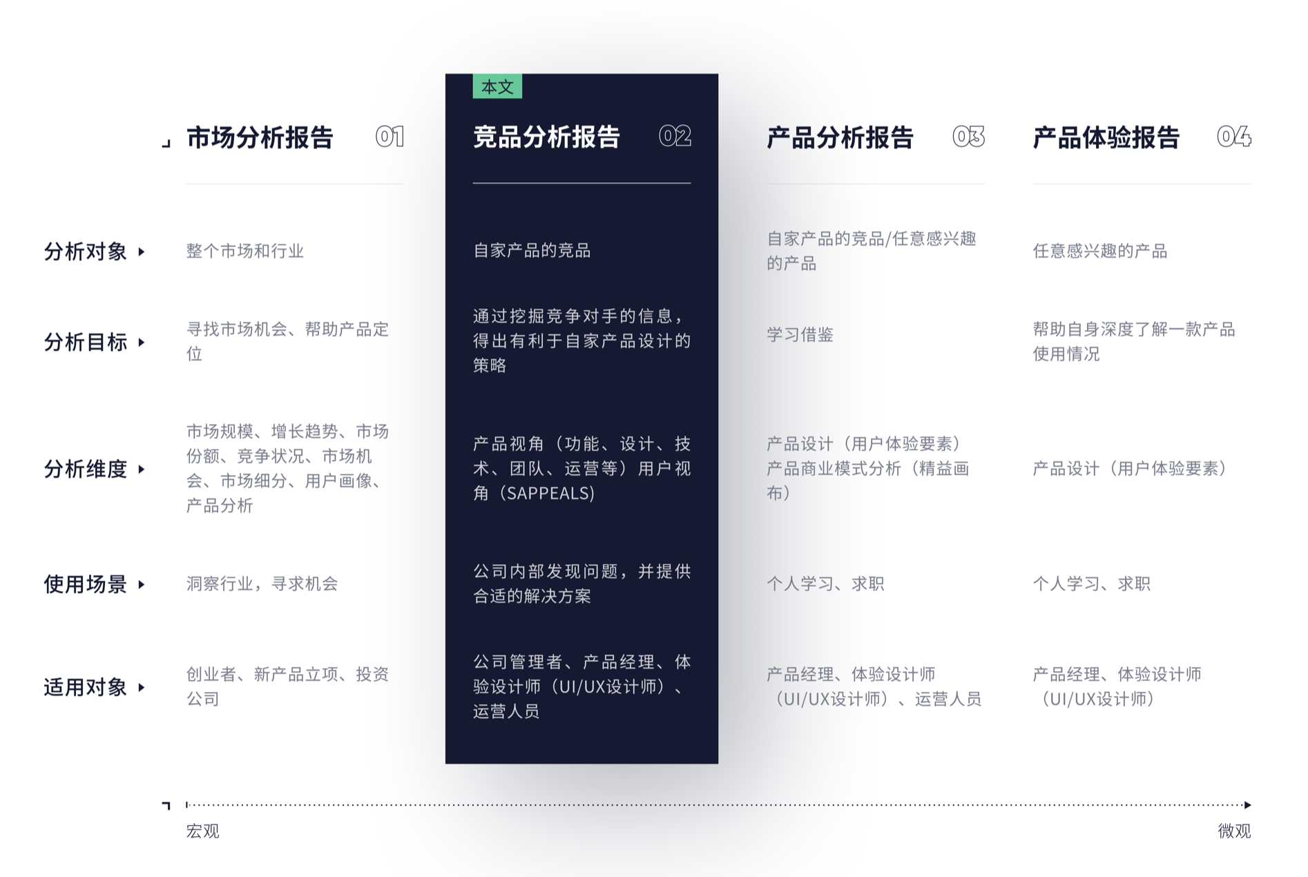 - 競品分析報告:分析對象是自家產(chǎn)品的競品,目標(biāo)是學(xué)習(xí)借鑒,分析維度為產(chǎn)品分析,使用場景是公司內(nèi)部發(fā)現(xiàn)問題并提供參考,適用對象是產(chǎn)品經(jīng)理、體驗設(shè)計師等。