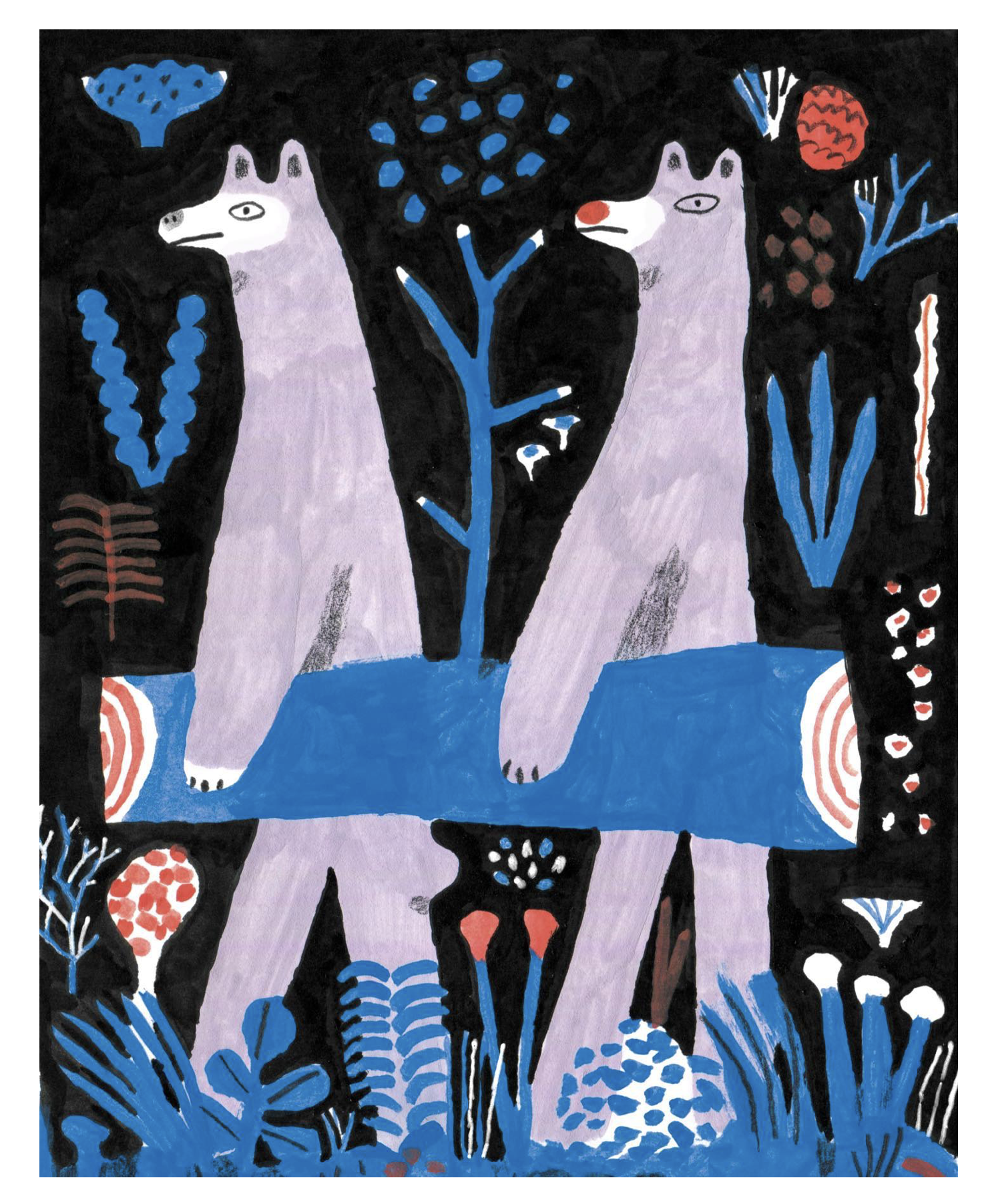 Andrea 的畫,第一眼就帶著 “不刻意的可愛”。他從不用規(guī)整的線條框定形象,反倒偏愛孩童般的 “稚拙感”:歪歪扭扭的動(dòng)物輪廓、不對(duì)稱的眼睛、翹得老高的嘴角,連植物的枝葉都像剛被風(fēng)吹得晃了晃 —— 比如那只圓滾滾的小熊,頂著歪歪的條紋帽子,爪子搭在蜂蜜罐上,明明線條簡(jiǎn)單到像隨手畫的草稿,卻讓人一眼就被它的憨態(tài)逗笑。這種 “反精致” 的風(fēng)格,恰恰打破了成人世界對(duì) “完美” 的執(zhí)念,就像小時(shí)候我們趴在桌上涂畫時(shí),從不在意線條是否筆直,只在乎筆下的角色是否 “有趣”。