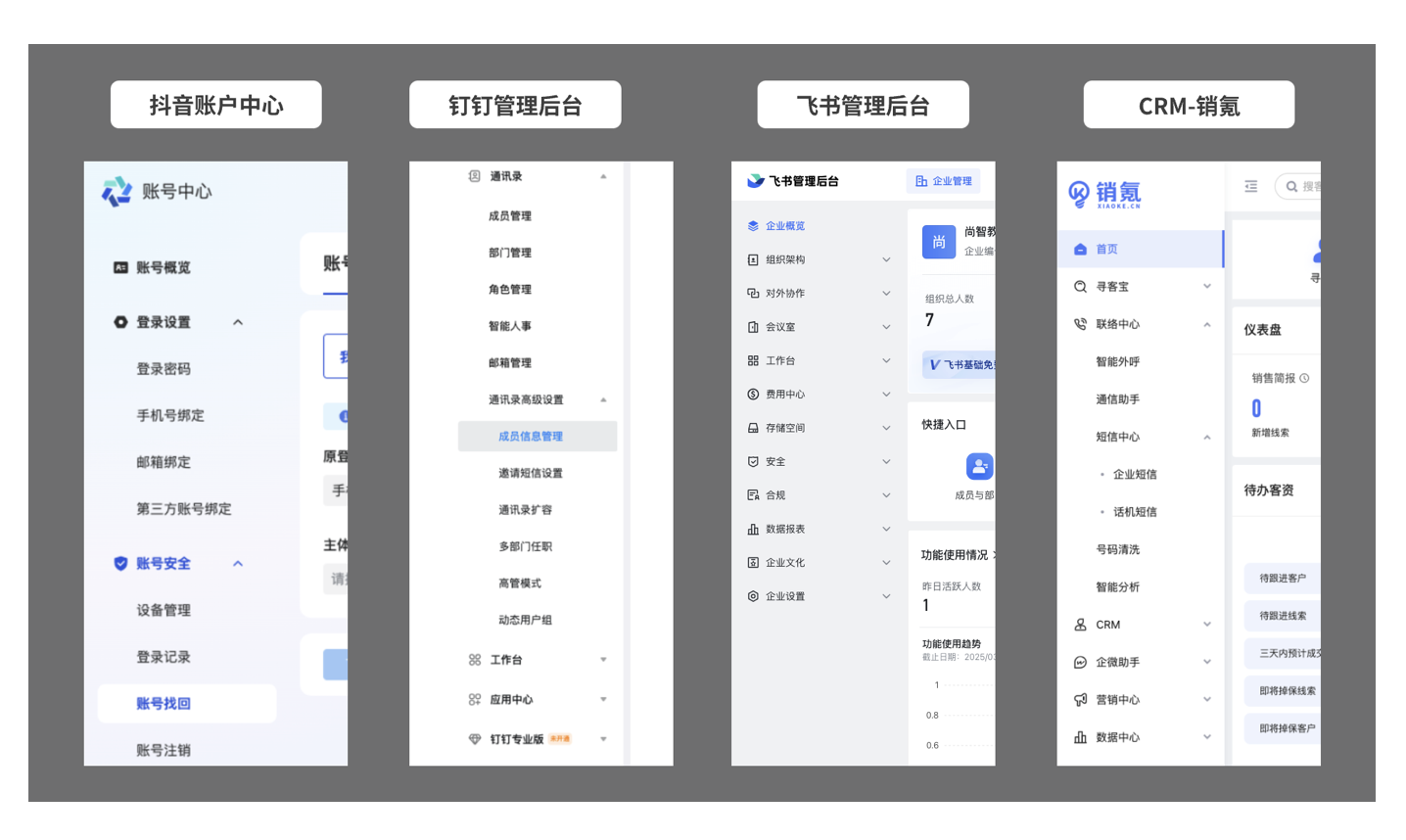 - 寬欄(混合導(dǎo)航):圖標(biāo)與文字并存,支持多級菜單嵌套,是最常見的側(cè)邊欄樣式。通過分組標(biāo)題和分割線提升信息密度,兼容性強(qiáng),適合業(yè)務(wù)復(fù)雜、功能模塊較多的系統(tǒng),如抖音賬戶中心、飛書管理后臺、釘釘管理后臺等。