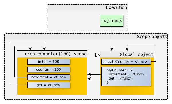 "use strict"; function createCounter(initial) { // ... } var myCounter1 = createCounter(100); var myCounter2 = createCounter(200);