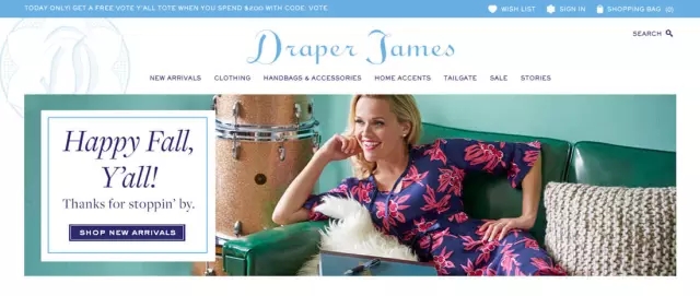 看看 Draper James 的服裝網(wǎng)站吧。首頁(yè)大圖中最吸引人的大概是妹子臉上的微笑吧?明亮的色彩給用戶愉悅的體驗(yàn),而隨后的文案內(nèi)容“Happy Fall,Y’all”它將秋季的愉悅情緒毫不掩飾地表露出來(lái),用戶在這個(gè)時(shí)候可以直接地體會(huì)到設(shè)計(jì)師的情感。當(dāng)然,這樣的設(shè)計(jì)針對(duì)性很明顯,有一部分用戶可能會(huì)因此離開(kāi),但是你需要針對(duì)這個(gè)進(jìn)行判斷。