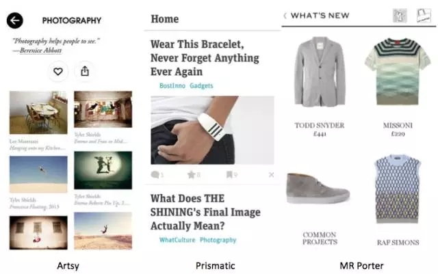 Artsy的圖片瀑布流,完全沒(méi)有用到線和面來(lái)區(qū)分信息組塊,而就是用內(nèi)容本身做排版,用戶可以更加集中注意力于圖片內(nèi)容上。Prismatic利用字體排版,盡可能的內(nèi)容前置,弱化圖標(biāo)和操作,讓用戶更集中注意力于內(nèi)容閱讀上。而MR Porter則利用商品圖片、名稱(chēng)和價(jià)格直接做設(shè)計(jì),讓用戶聚焦于商品本身。