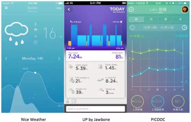 Nice Weather用曲線圖來(lái)表達(dá)溫度的變化,Jawbone UP用柱狀圖來(lái)表達(dá)每天的完成情況,PICOOC用折線圖來(lái)表達(dá)每天體重、體脂的變化。移動(dòng)APP利用數(shù)據(jù)可視化,可以在更小的屏幕空間內(nèi),更立體化的展示內(nèi)容。
